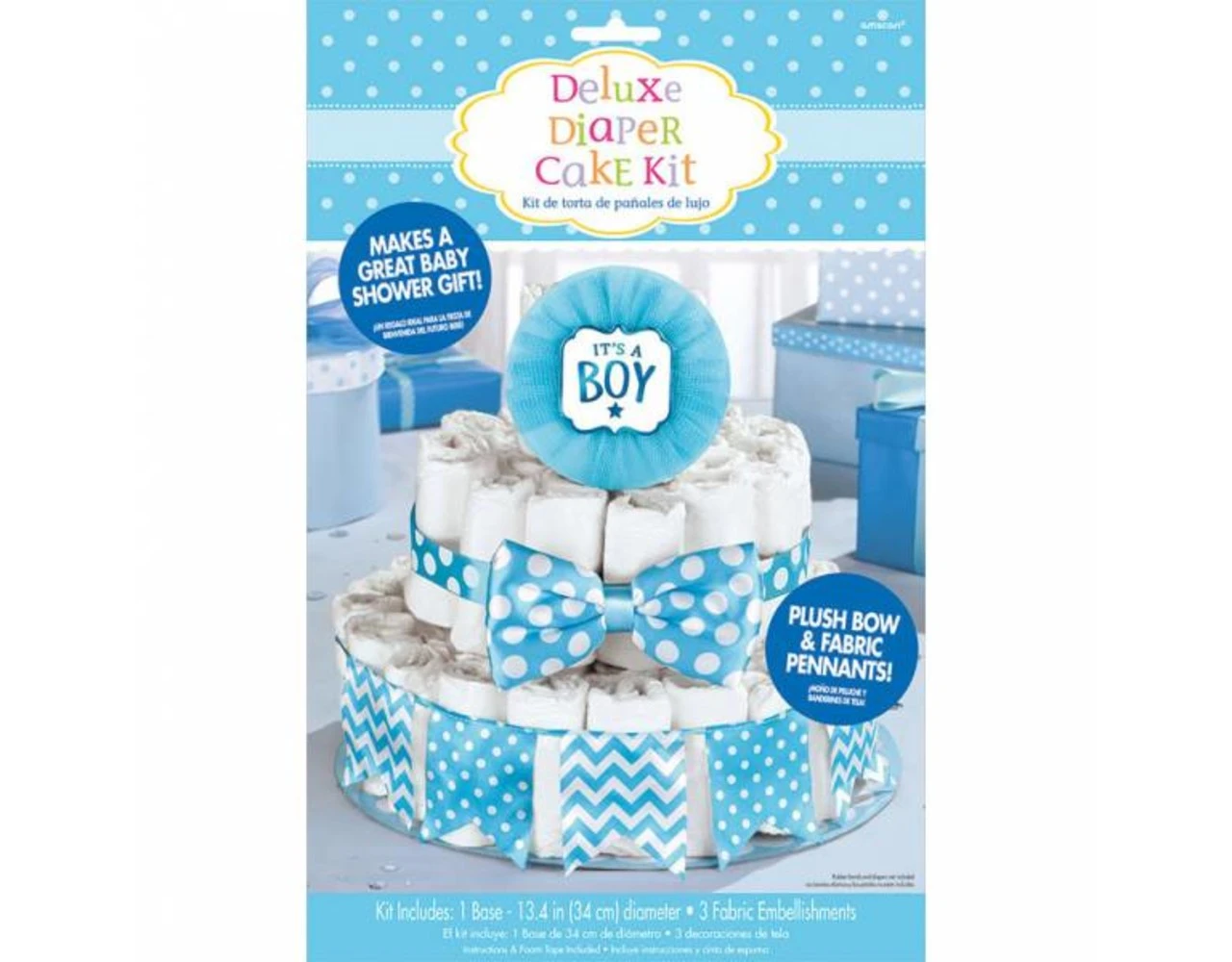 Inhoud:1x ronde kartonnen presenteerblad (dia: 34cm),1x stoffen vlaggenlijntje,1x stoffen strik en1x stoffen taarttopper. (excl luiers)