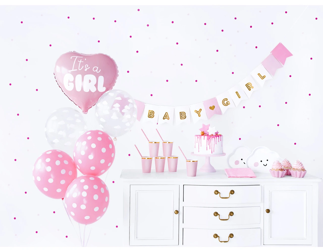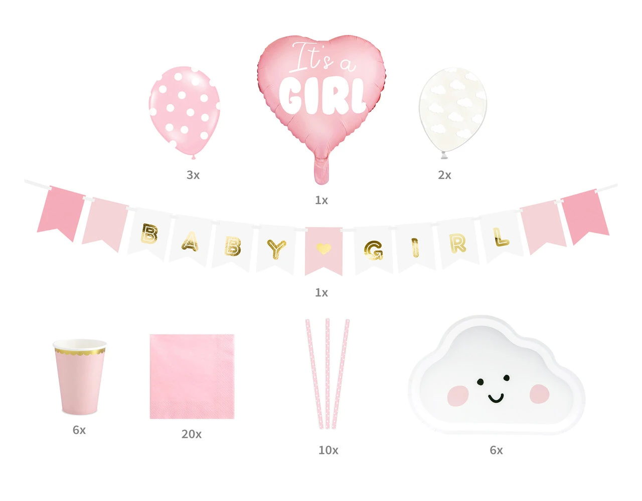 Inhoud: Party versieringen instellen – Het is een meisje, set bestaat uit: banner Baby Girl (1 stuk), papieren bekers (6 stuks), papieren borden (6 stuks), papier rietjes (10 stuks), papieren servetten (20 stuks), folie ballon ( piece 1) en latex ballonnen (mix ontwerpen, 5 stuks).