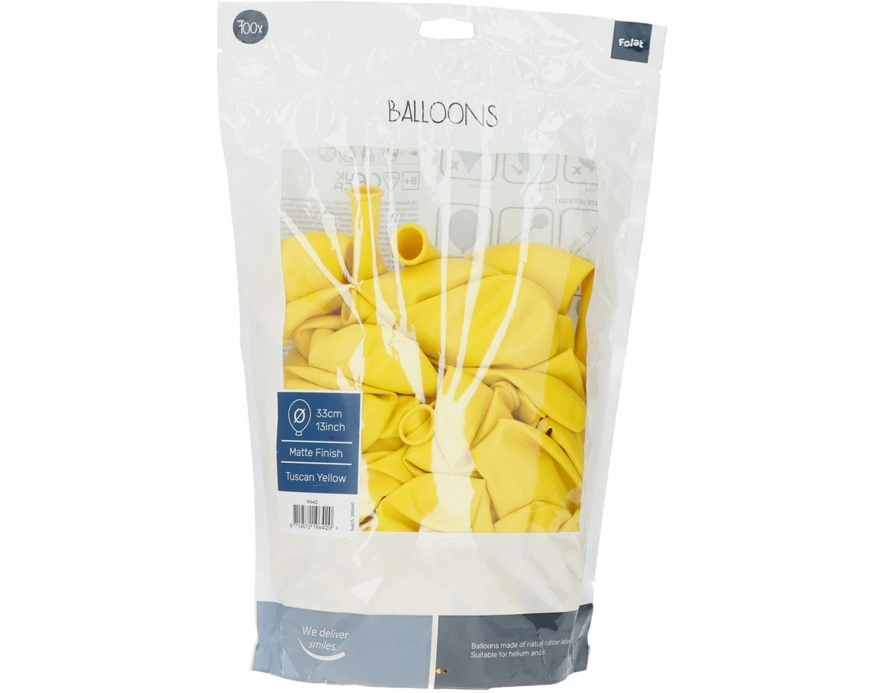 Ballonnen Tuscan Yellow Mat 33cm – 100 stuks. Inhoud: 100 latex ballonnen. Kleur: Geel. Bijvoorbeeld te gebruiken tijdens de volgende feestgelegenheid/feestgelegenheden: Verjaardag, Kinderfeestje en Themafeest. Elke ballon is 13 inch/33 cm. Het artikel is gemaakt van latex.