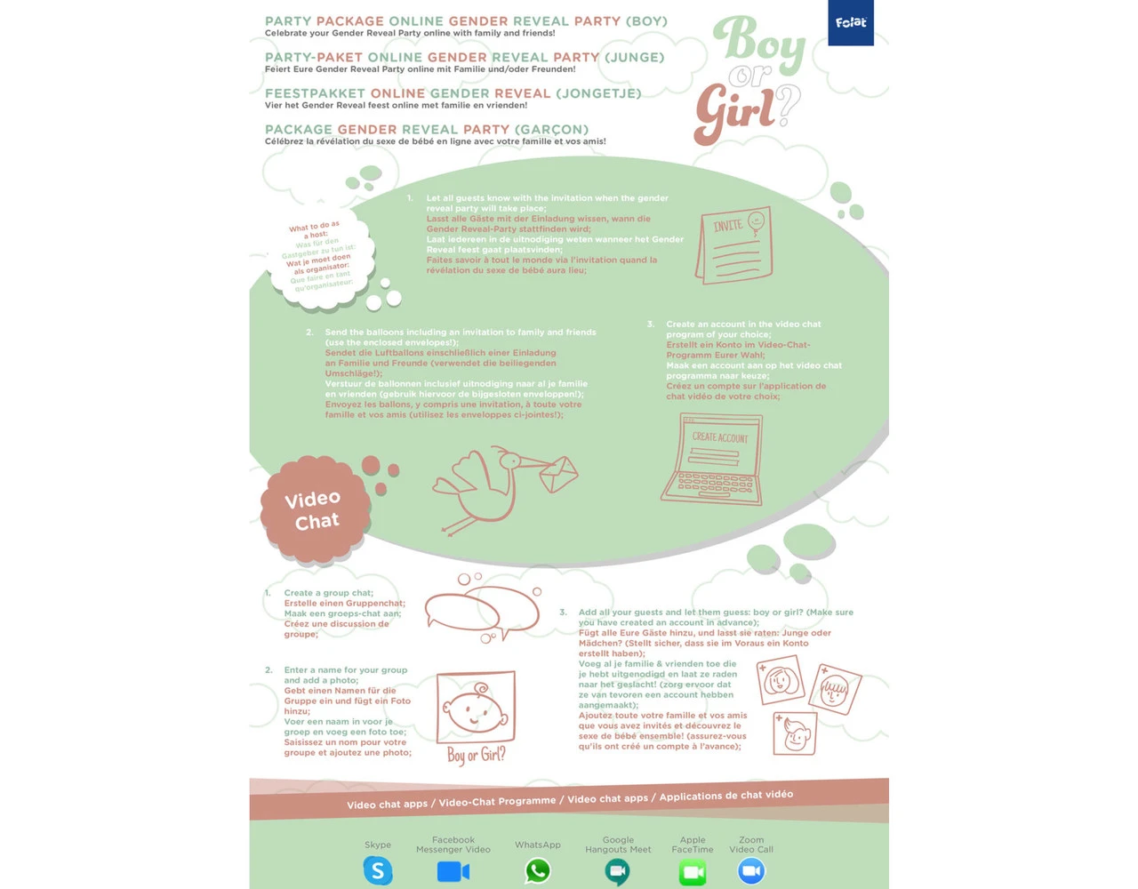 Inhoud: 6 enveloppen en uitnodigingen met uitleg voor genodigden, 3 gender reveal ballonnen met blauwe confetti, taart toppers, 1 vlaggenlijn, 1 set met folieballonnen BABY, 1 honeycomb waaier, 1 pompom en 12 beschrijfbare ballonnen (waarvan 6 roze en 6 blauw).