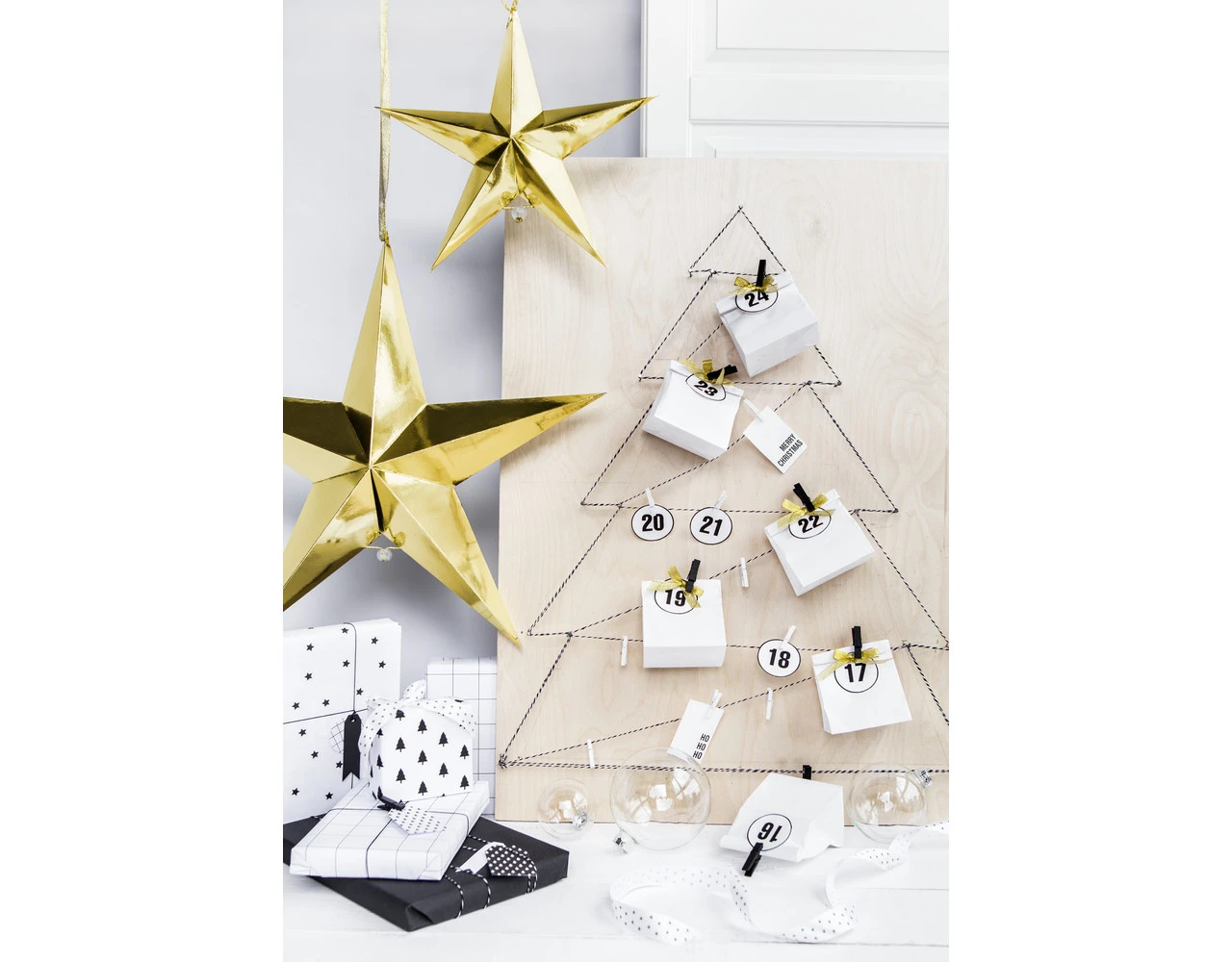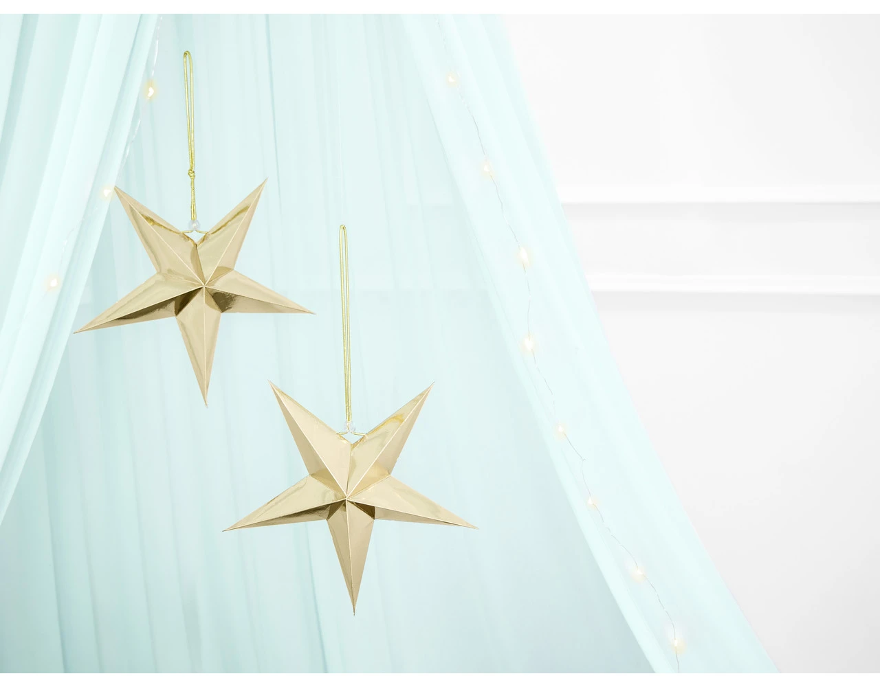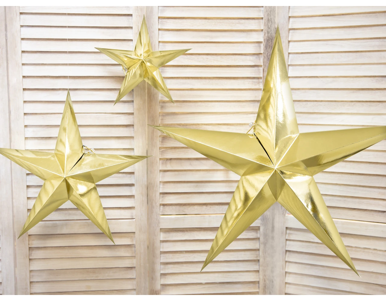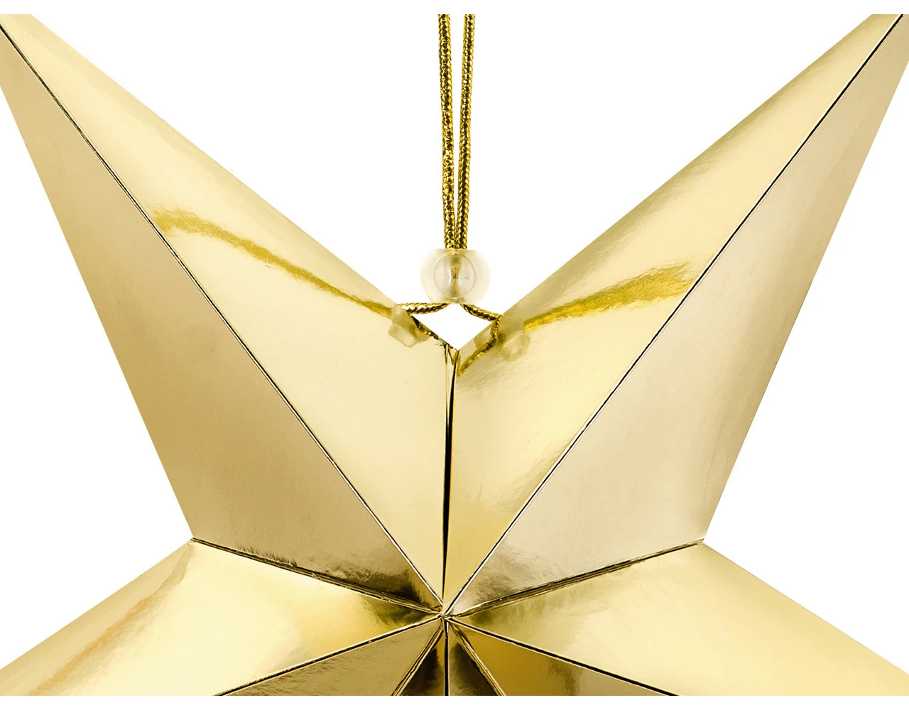 Inhoud: Papier ster, vijf punt, gemaakt van spiegel goud papier, met goud touw, diameter ong. 45 cm. Doe het zelf product.