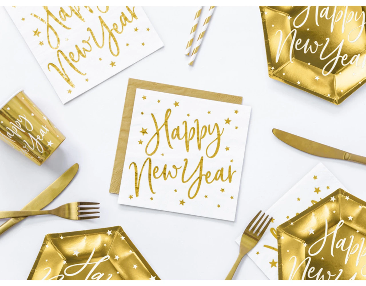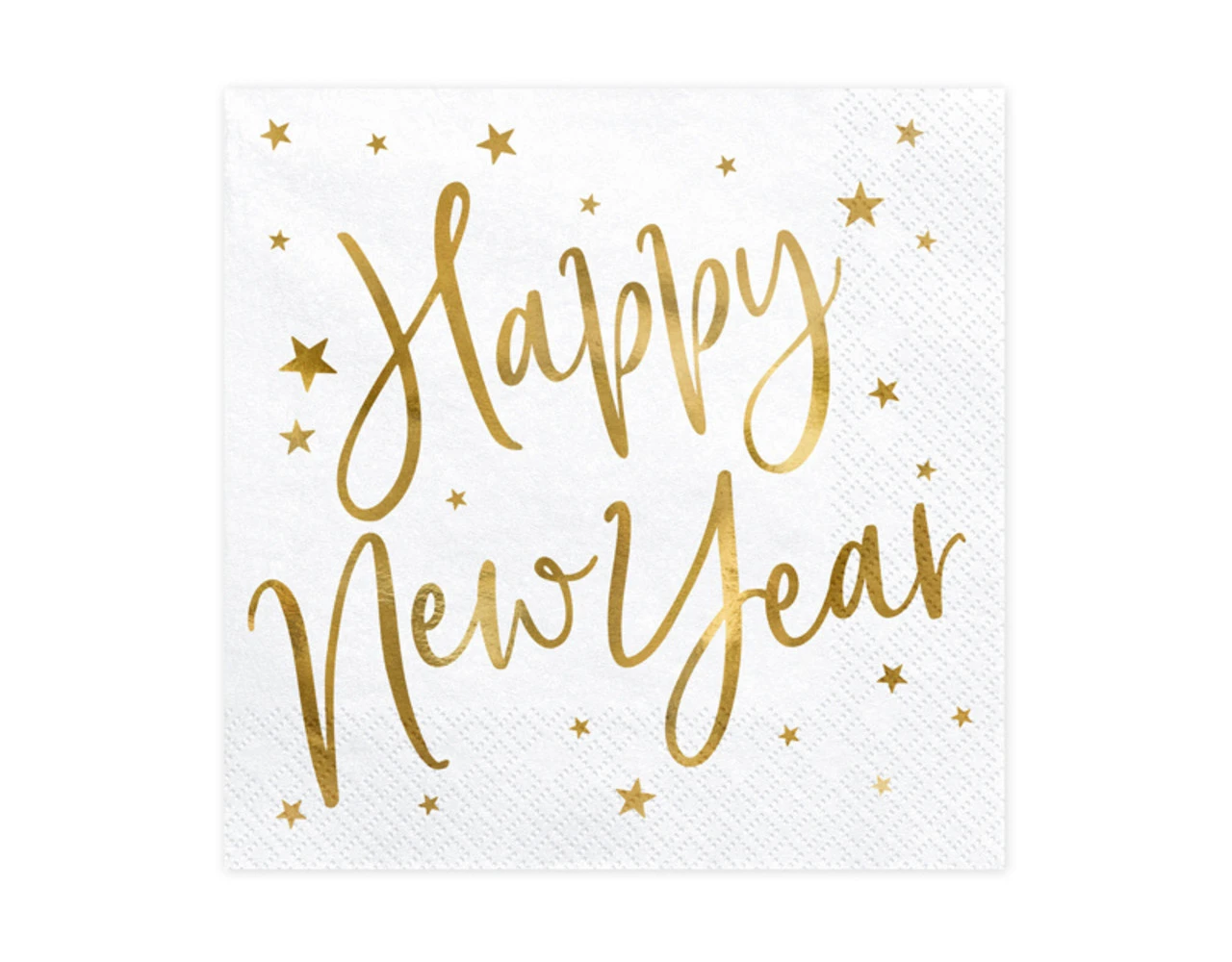 Papieren servetten in witte kleur met goudmetallic patroon van sterren en opschrift Happy New Year, afmeting na uitvouwen ca. 33 x 33 cm, afmeting na samenvoegen ca. 16,5 x 16,5 cm.