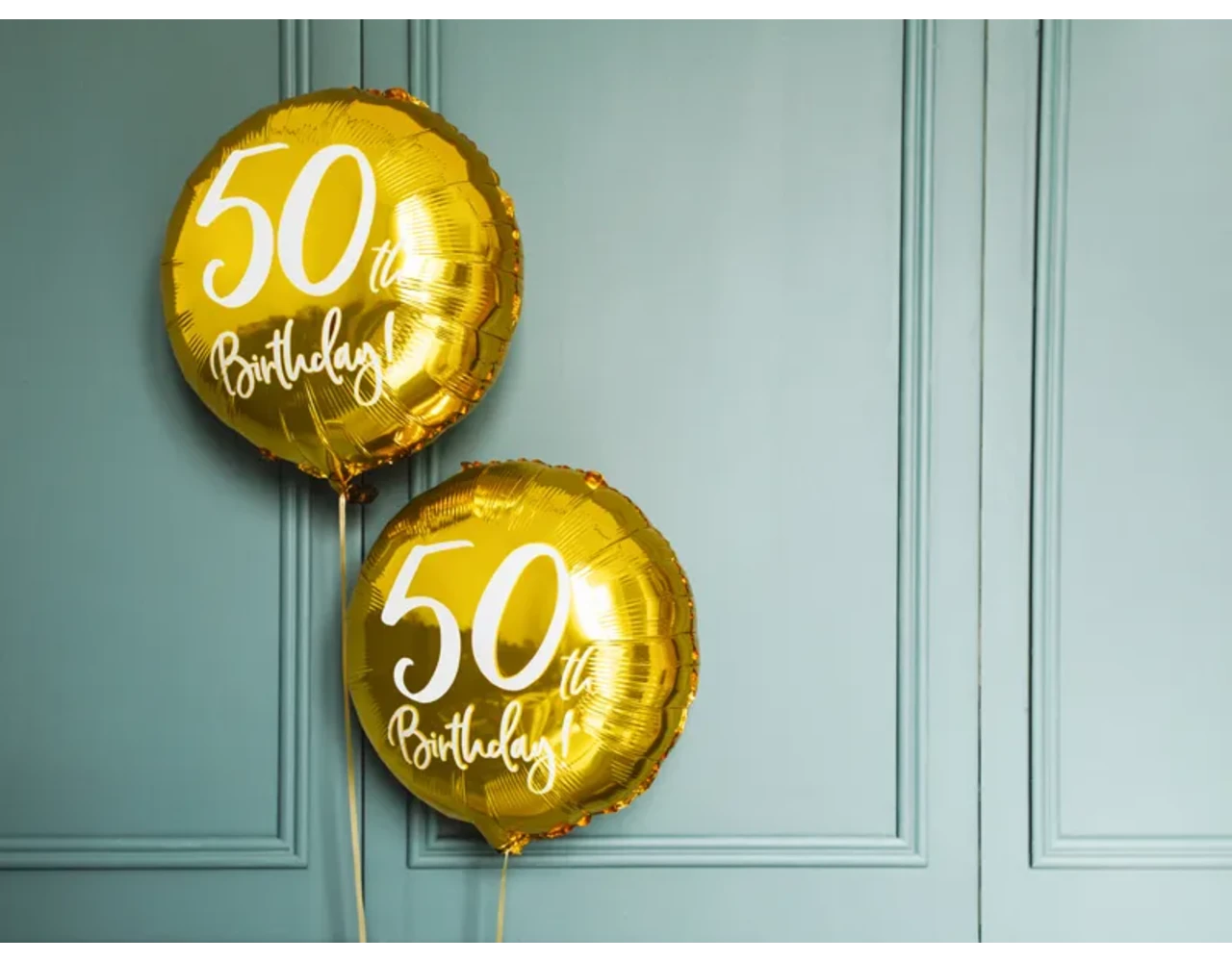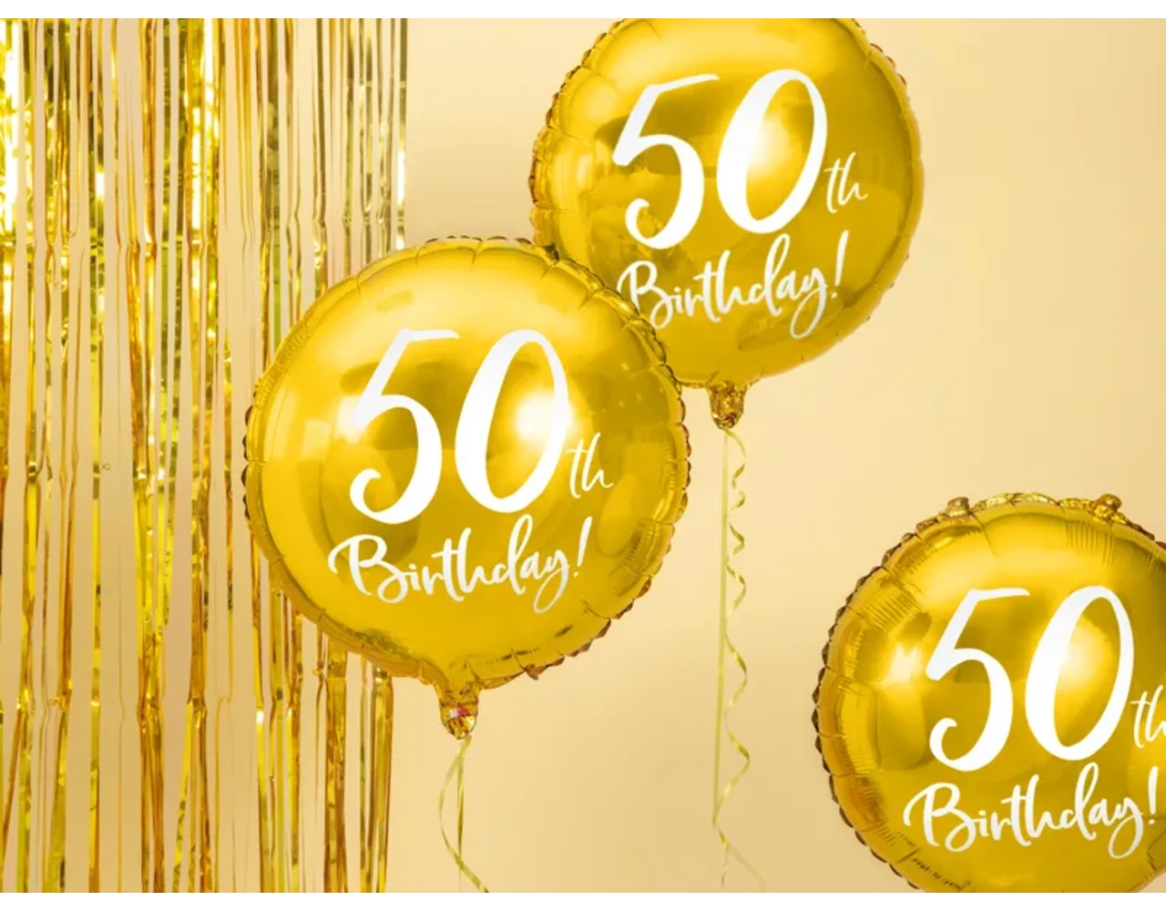 Metallic ronde folieballon, goud met witte inscriptie 50e verjaardag, diameter ca. 45 cm (18”).