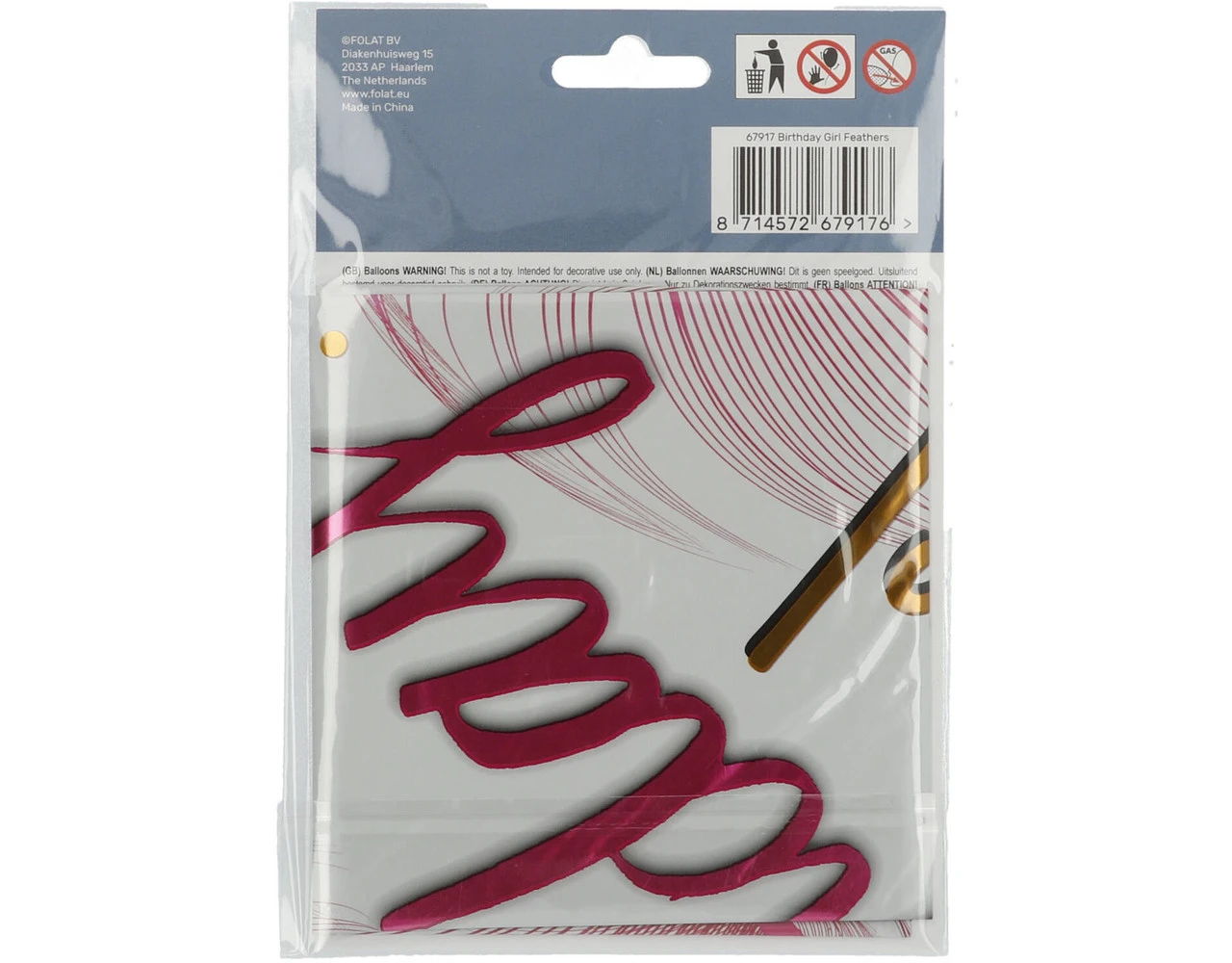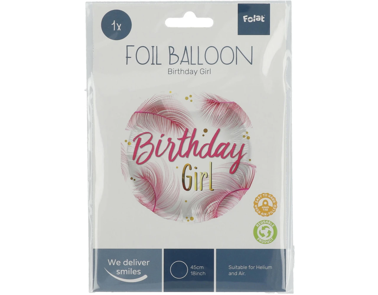Folieballon Birthday Girl Veren – 45 cm. Inhoud: 1 folieballon. Kleur: Roze. Bijvoorbeeld te gebruiken tijdens de volgende feestgelegenheid/feestgelegenheden: Verjaardag en Kinderfeestje. Deze folieballon is 18 inch/45 cm. Het artikel is gemaakt van folie.