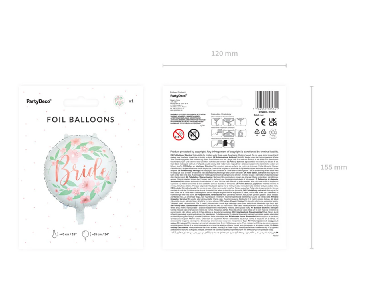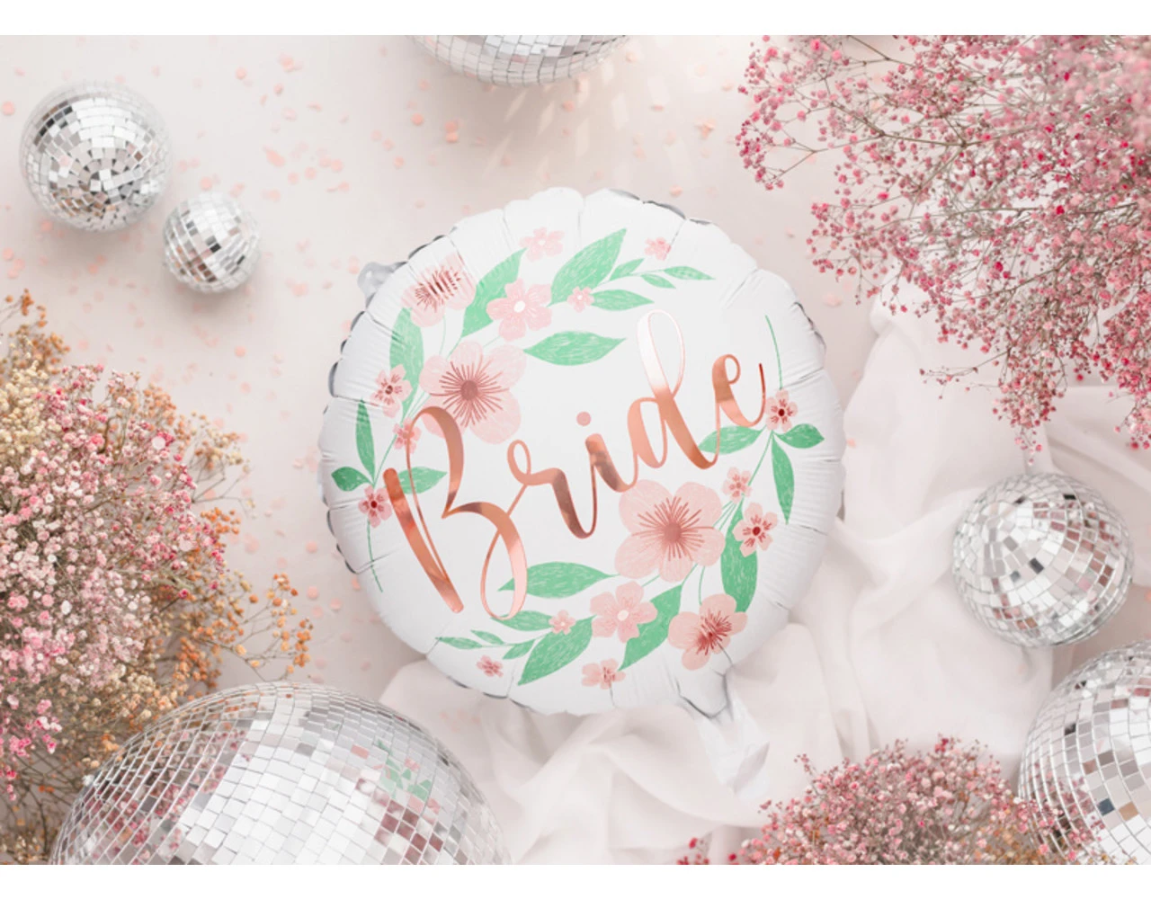 Folieballon Bruid in witte kleur met inscriptie Bruid in gouden kleur, afmeting voor opblazen ca. 45 cm, afmeting na opblazen ca. 35 cm. Opblaasbaar met lucht en helium. Set bevat een rietje.