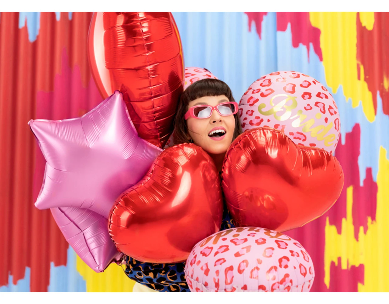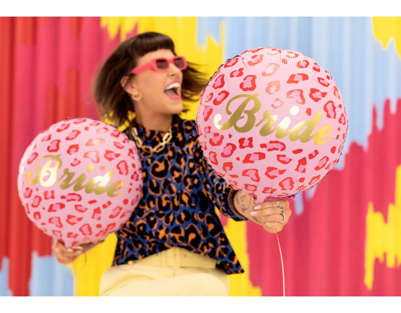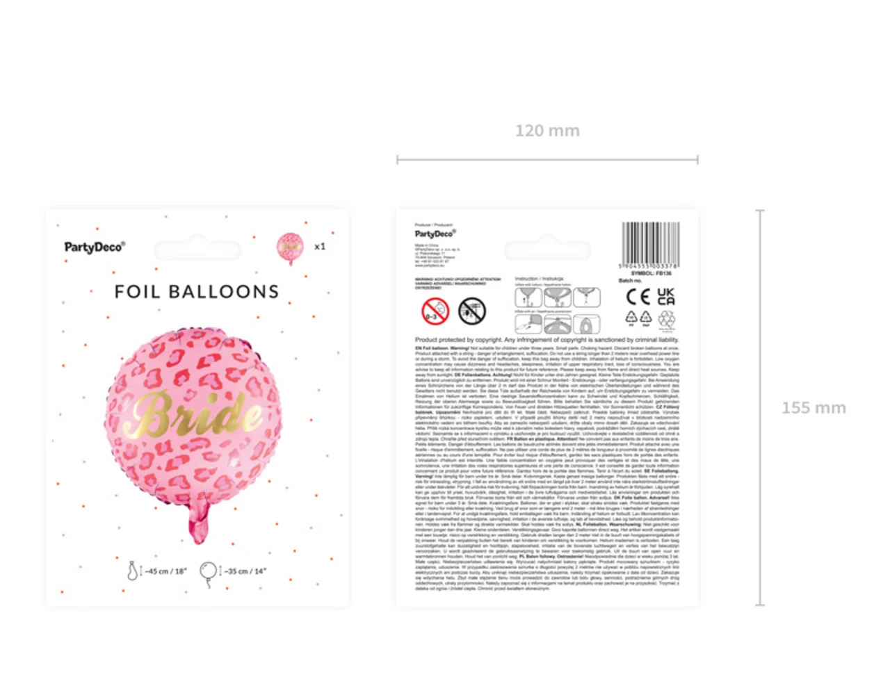 Folieballon Bride, mix van kleuren met gouden opschrift Bride, afmeting voor opblazen ca. 45 cm (18″), afmeting na opblazen 35 cm (14″). Op te blazen met lucht en helium. Set bevat een rietje.