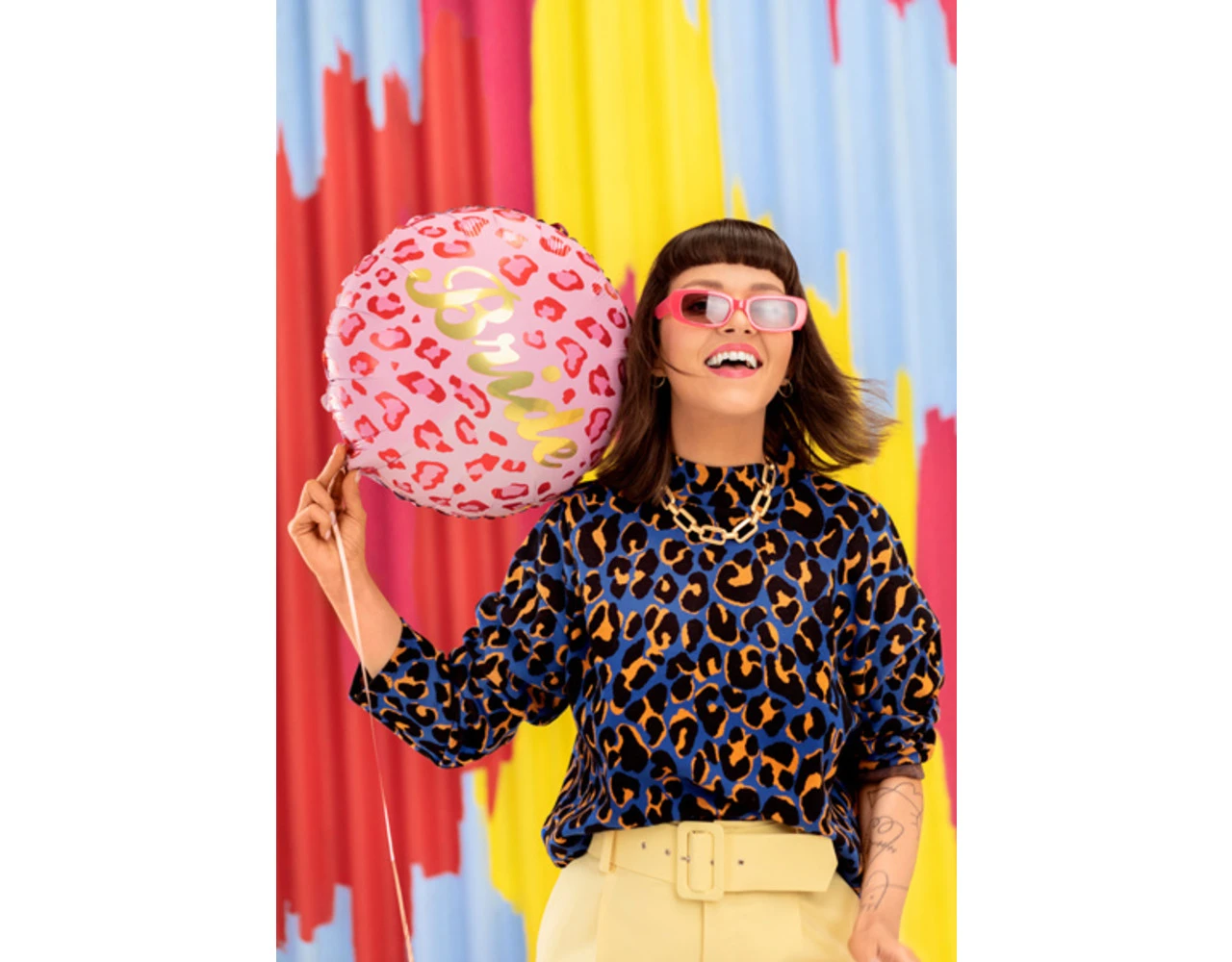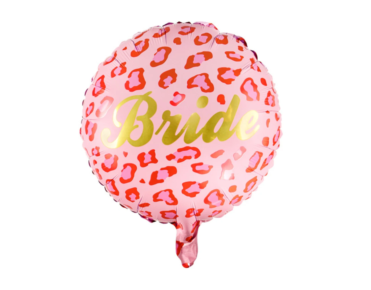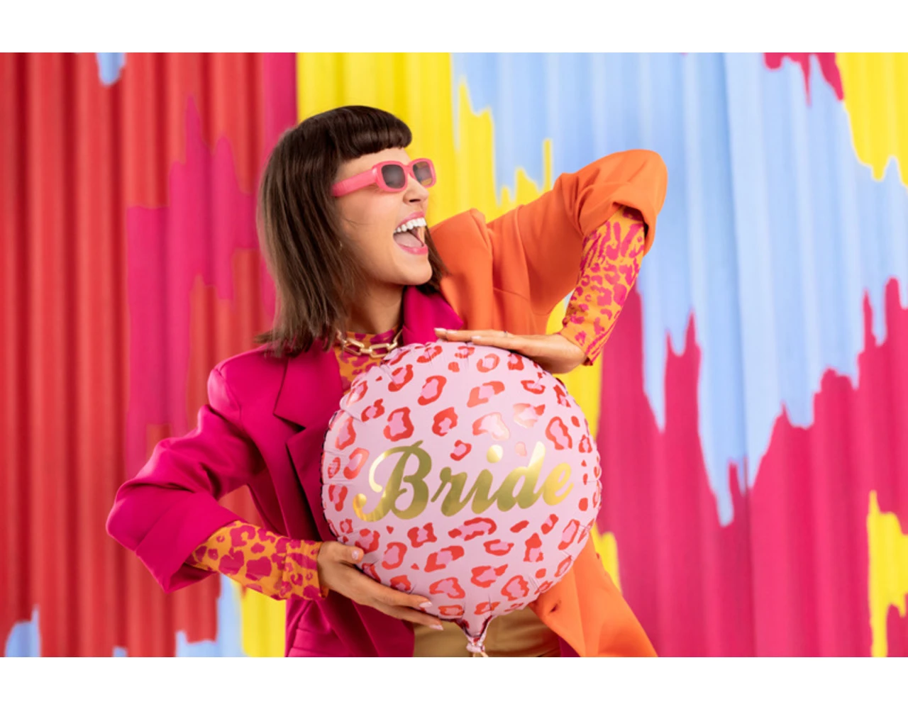 Folieballon Bride, mix van kleuren met gouden opschrift Bride, afmeting voor opblazen ca. 45 cm (18″), afmeting na opblazen 35 cm (14″). Op te blazen met lucht en helium. Set bevat een rietje.