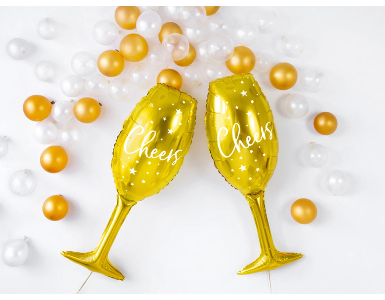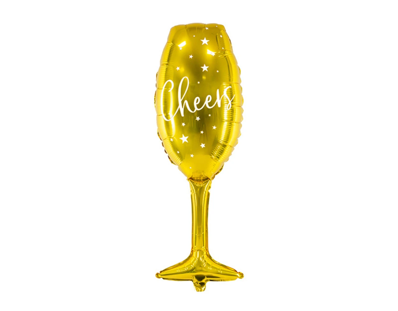 Metallic folie ballon Glas in goudkleur met witte inscriptie ”Cheers”, Formaat ca. 28 x 80 cm (11 x 31.5”).
