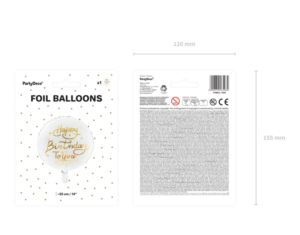 Matte folieballon in witte kleur met goudmetallic opschrift Happy Birthday To You, diameter voor opblazen ca. 45 cm (18”), diameter ca. 35 cm (14”). Opblazen met helium.