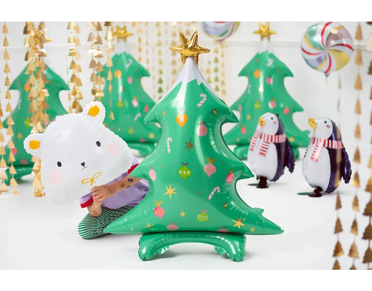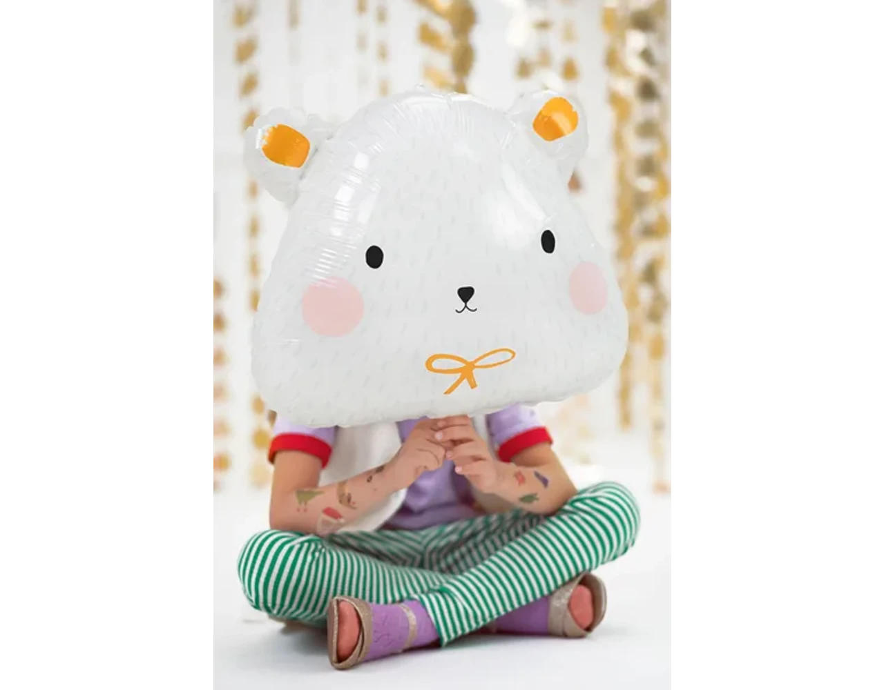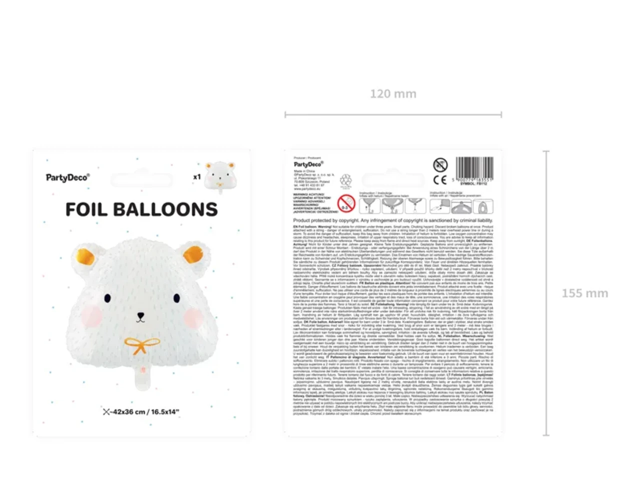 Matte folie ballon IJsbeer in witte kleur met kleurrijke en gouden satijn print, maat ca. ok. 51 x 45 cm (20 x 18 ”).
