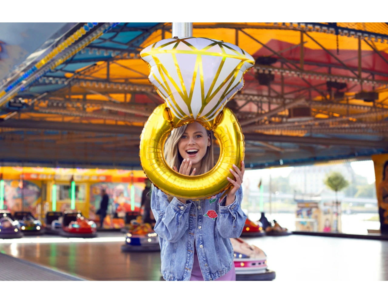 Glanzende folieballon in de vorm van een ring, mix van kleuren, afmeting voor opblazen ca. 60 x 95 cm, afmeting na opblazen ca. 56 x 75 cm. Opblazen met helium en lucht.