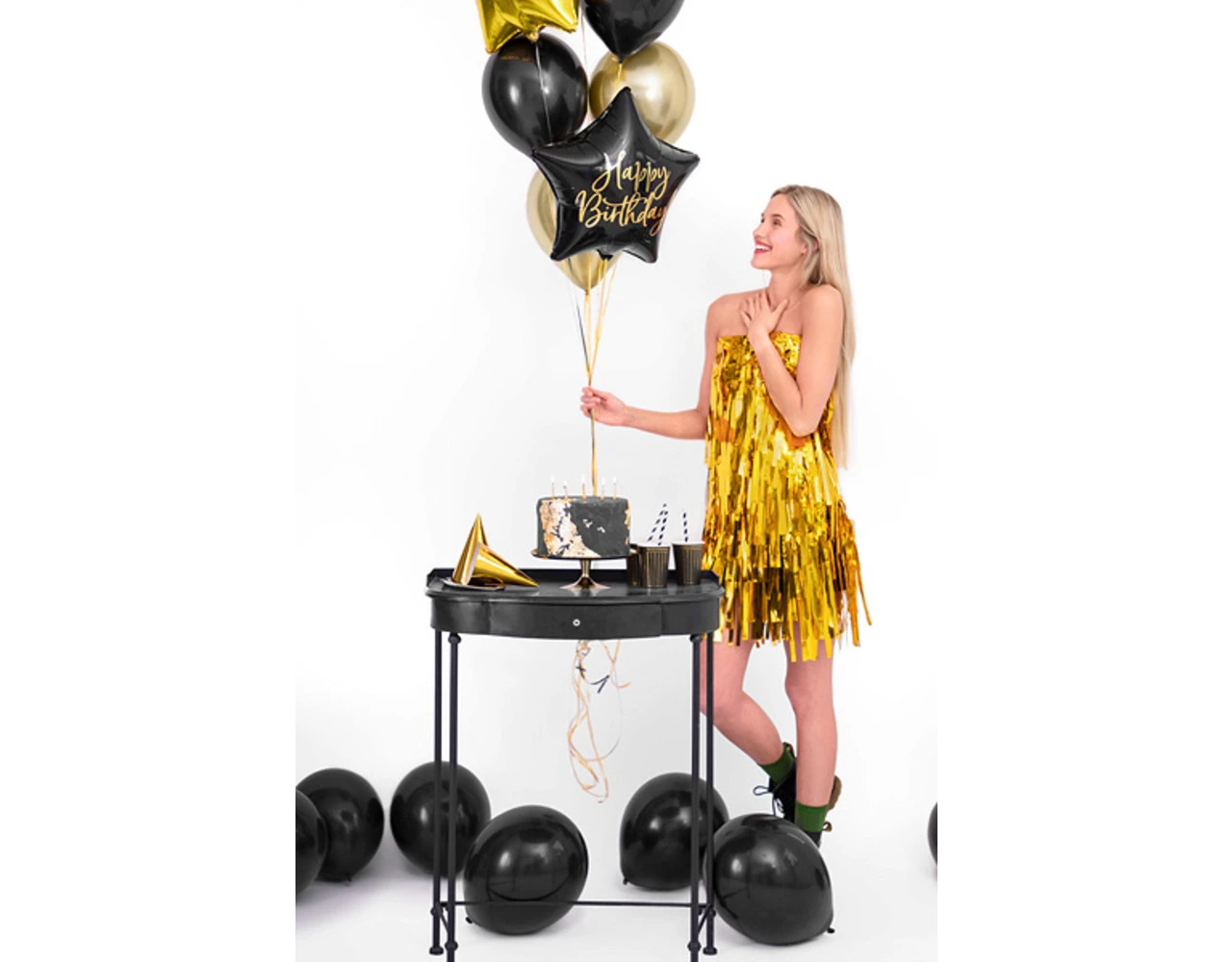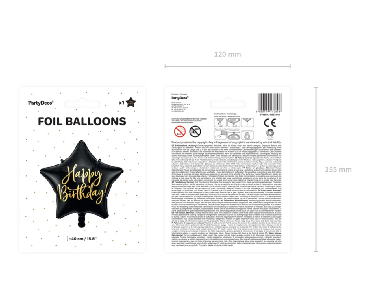 Glanzende folieballon in de vorm van een ster in zwarte kleur met goudmetallic opschrift Happy Birthday, afmeting voor opblazen ca. 47 cm (18.5”), afmeting na opblazen ca. 40 cm (15.5”). Op te blazen met helium en lucht.