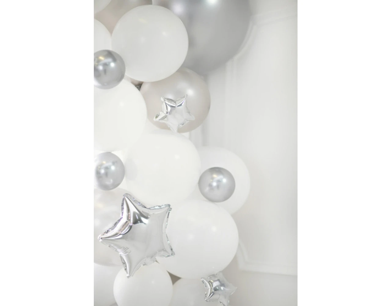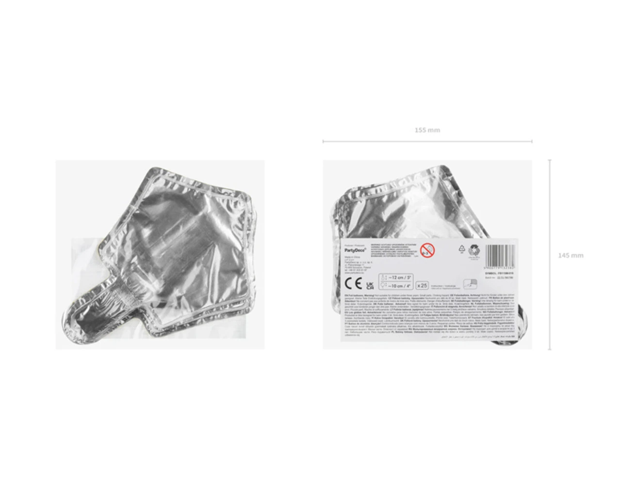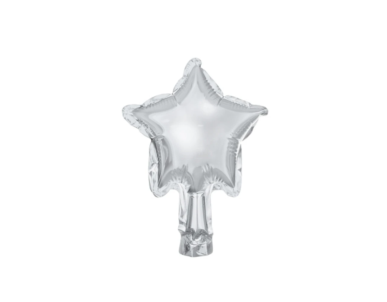 Metallic folieballonnen in de vorm van sterren in zilverkleur, hoogte voor opblazen ca. 12 cm, hoogte na opblazen ca. 10 cm. Opblazen met lucht.