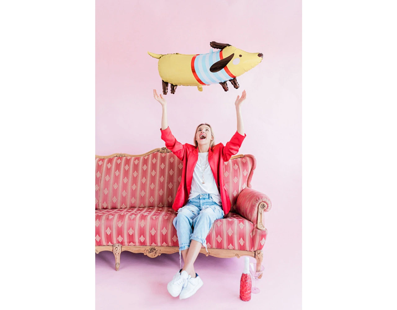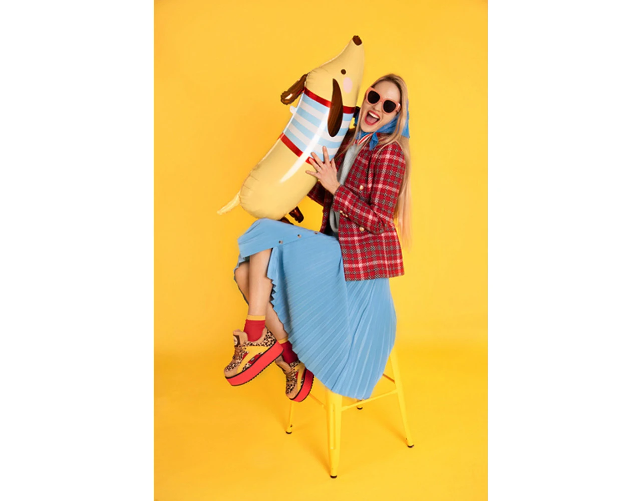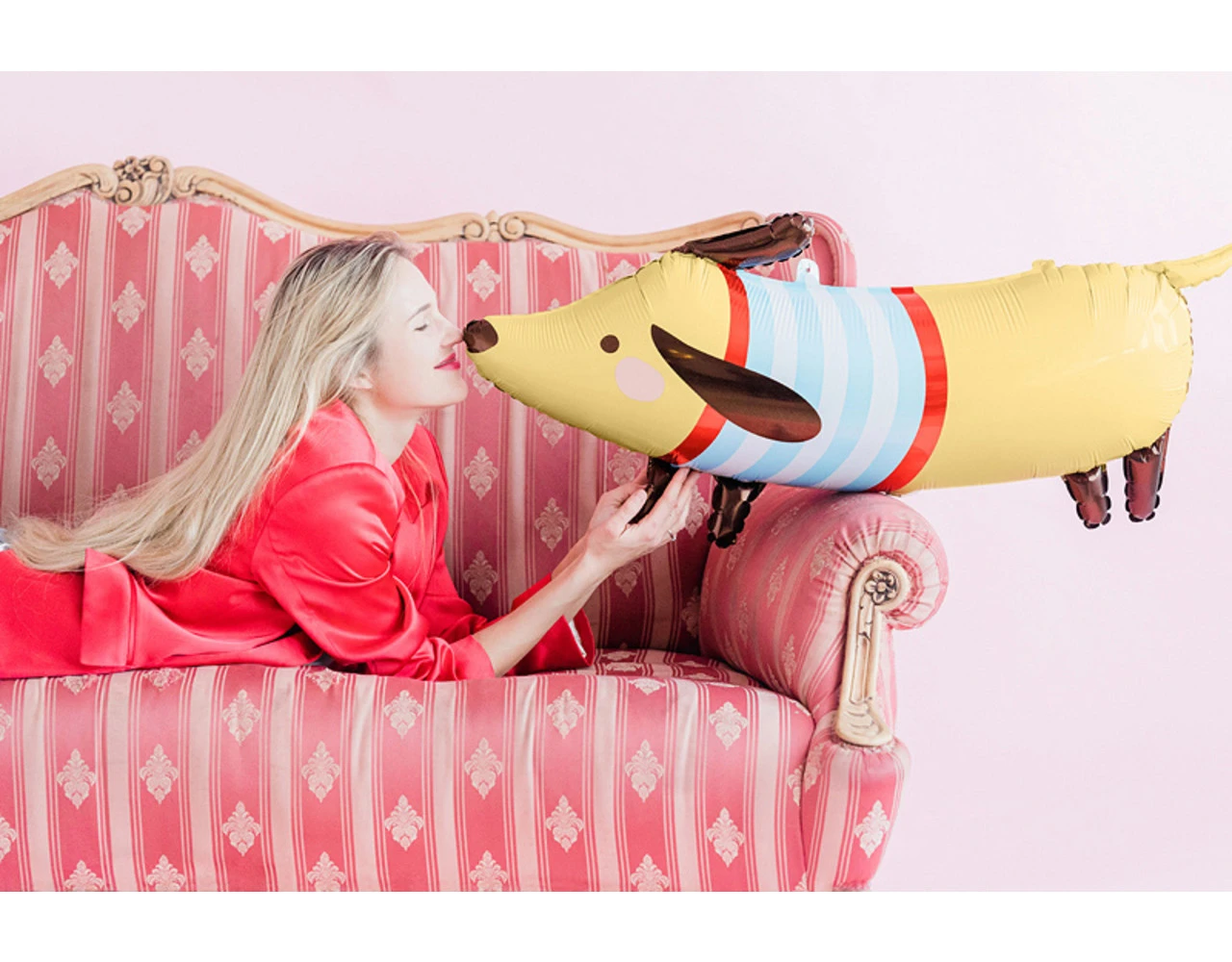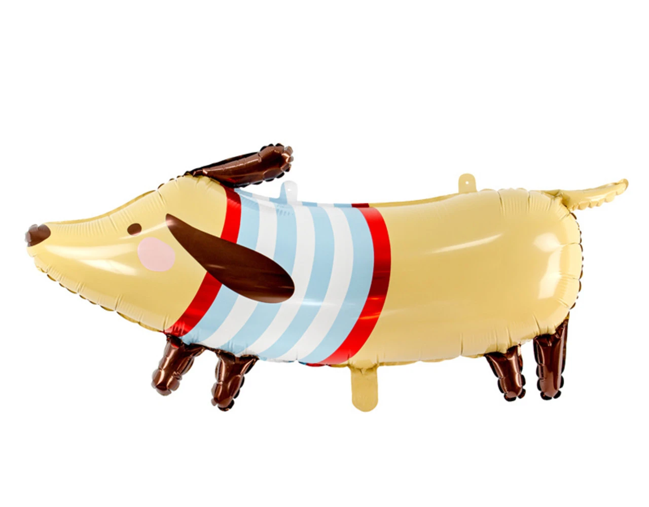 Matte folieballon Teckel, mix van kleuren, afmeting voor opblazen ca. 96 x 58 cm (38 x 23”), afmeting na opblazen ca. 92 x 40 cm (36 x 16”). Opblazen met lucht en helium