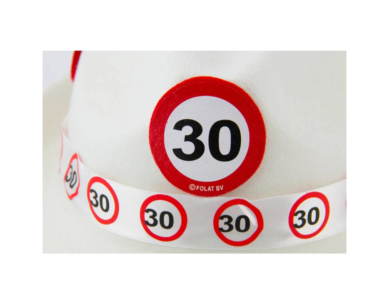 30 Jaar Verkeersbord Trilby Hoed Wit. Inhoud: 1 hoed, kleur: Wit. Bijvoorbeeld te gebruiken tijdens de volgende feestgelegenheid/feestgelegenheden: Carnaval, Themafeest, Halloween. Deze hoed is 23 cm breed en 37cm hoog. Het artikel is gemaakt van polyester.