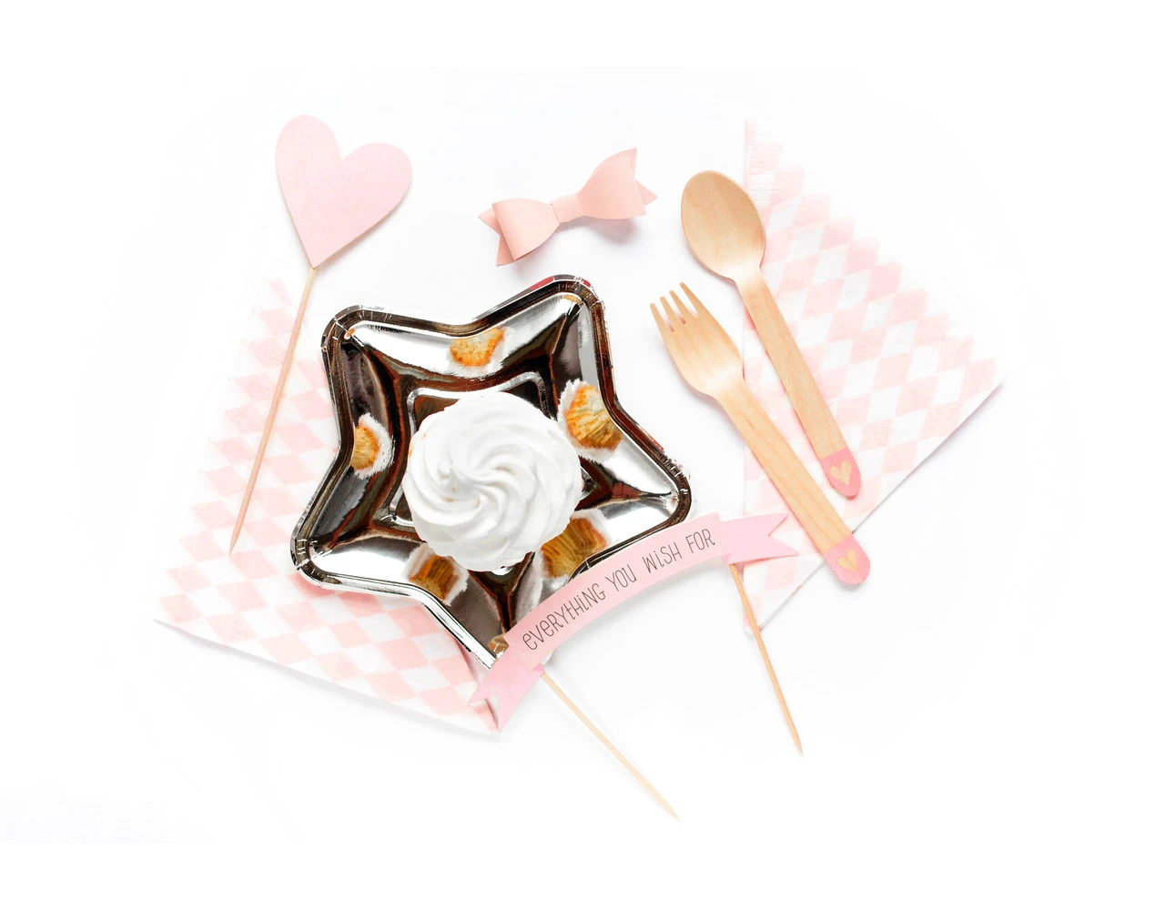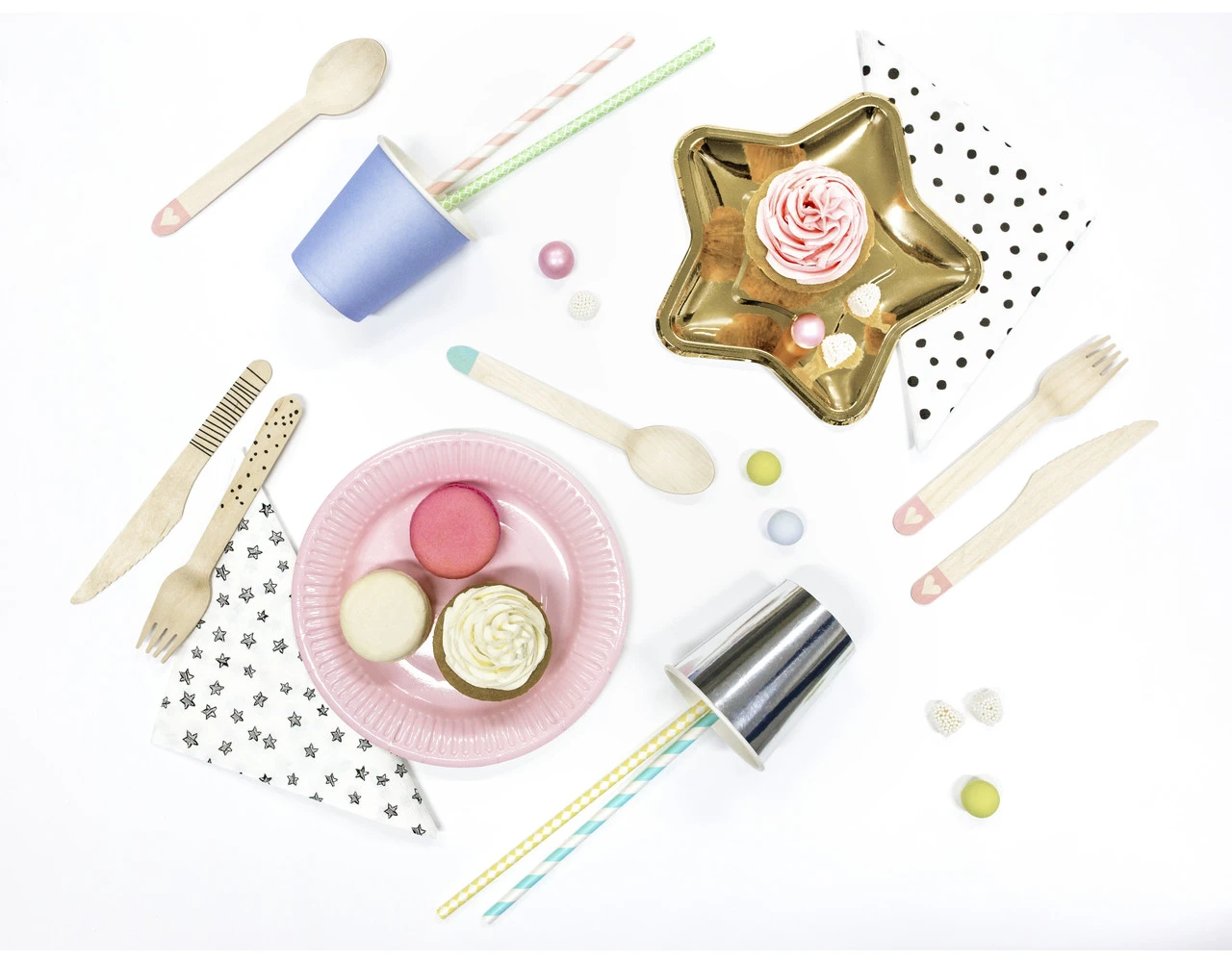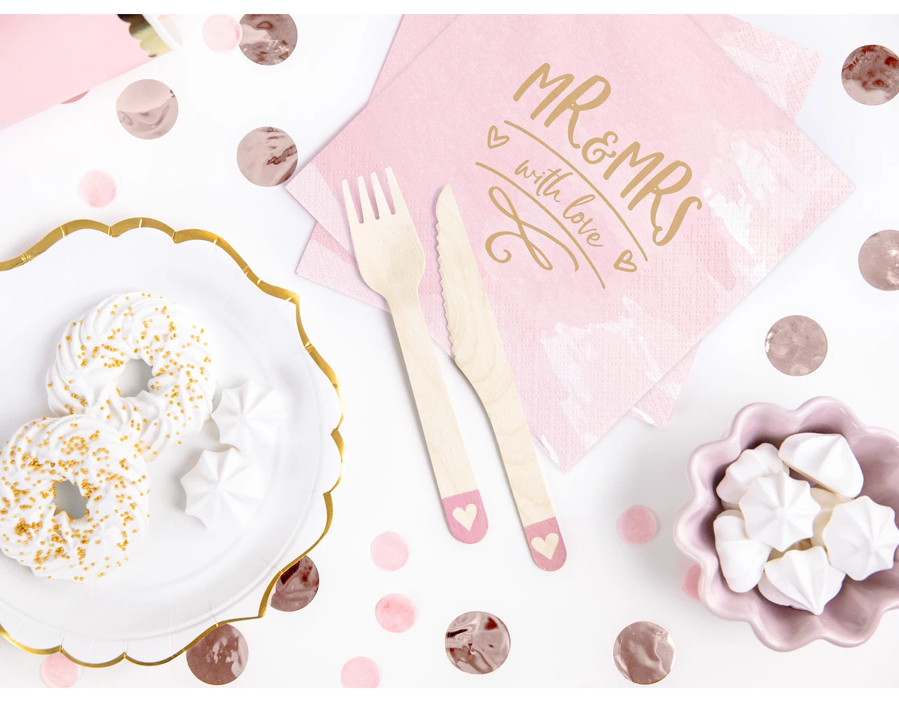 Inhoud: Houten bestek Harten met blozen roze druk, hoogte ca. 16 cm, set bevat 6 lepels, vorken 6 en 6 messen. (1 PKT / 18 st.)