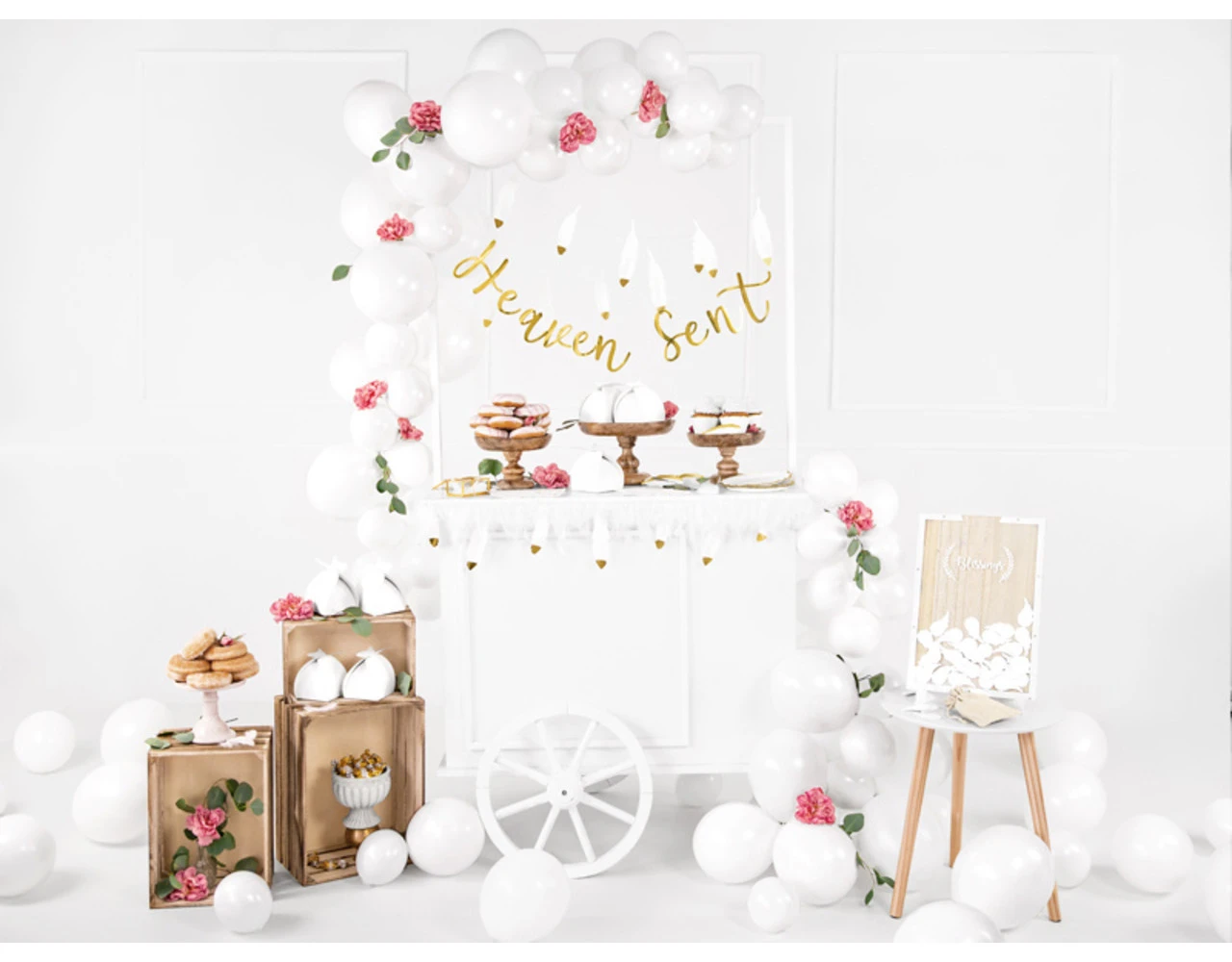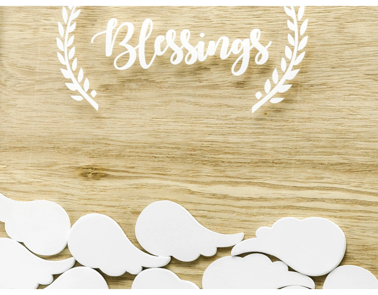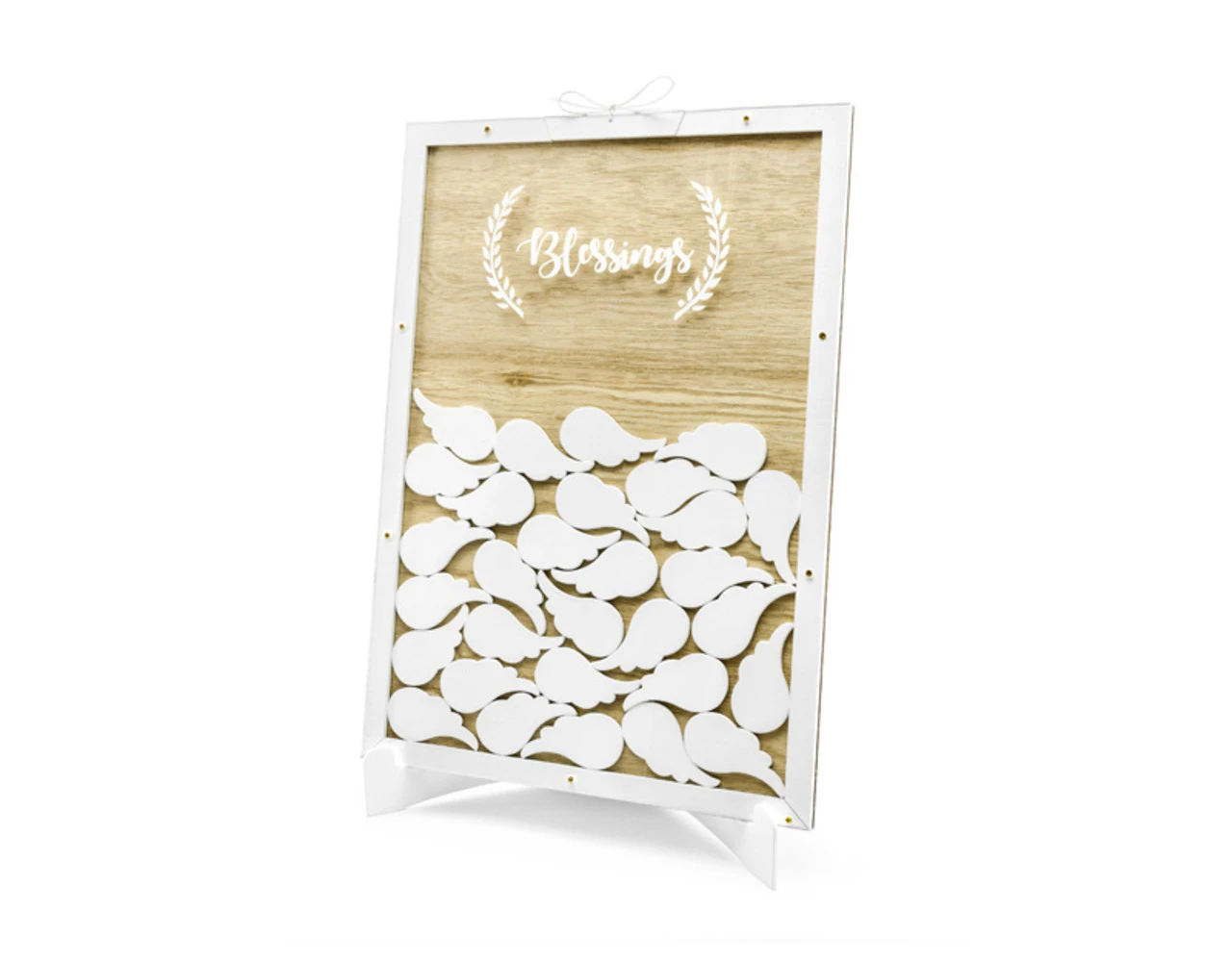 Houten gastenboek met wit opschrift Blessings, set bevat gastenboek in de vorm van rechthoek en 30 witte vleugels om in te schrijven, afmeting ca. 27,5 x 39,5 cm.