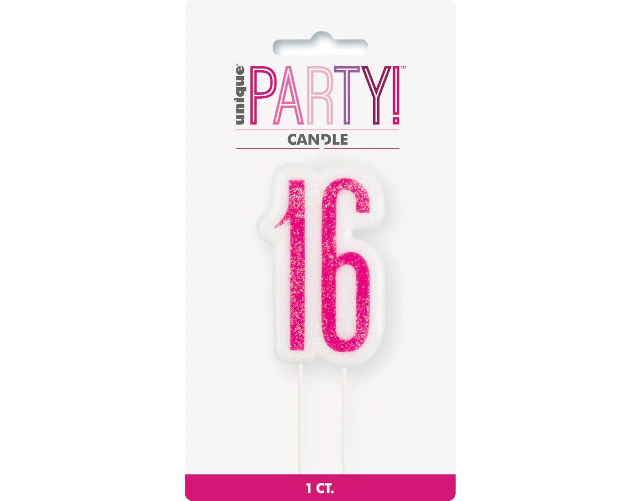 Verpakkingsinhoud: Kaars 16 Jaar Glitter Roze 8,5cm