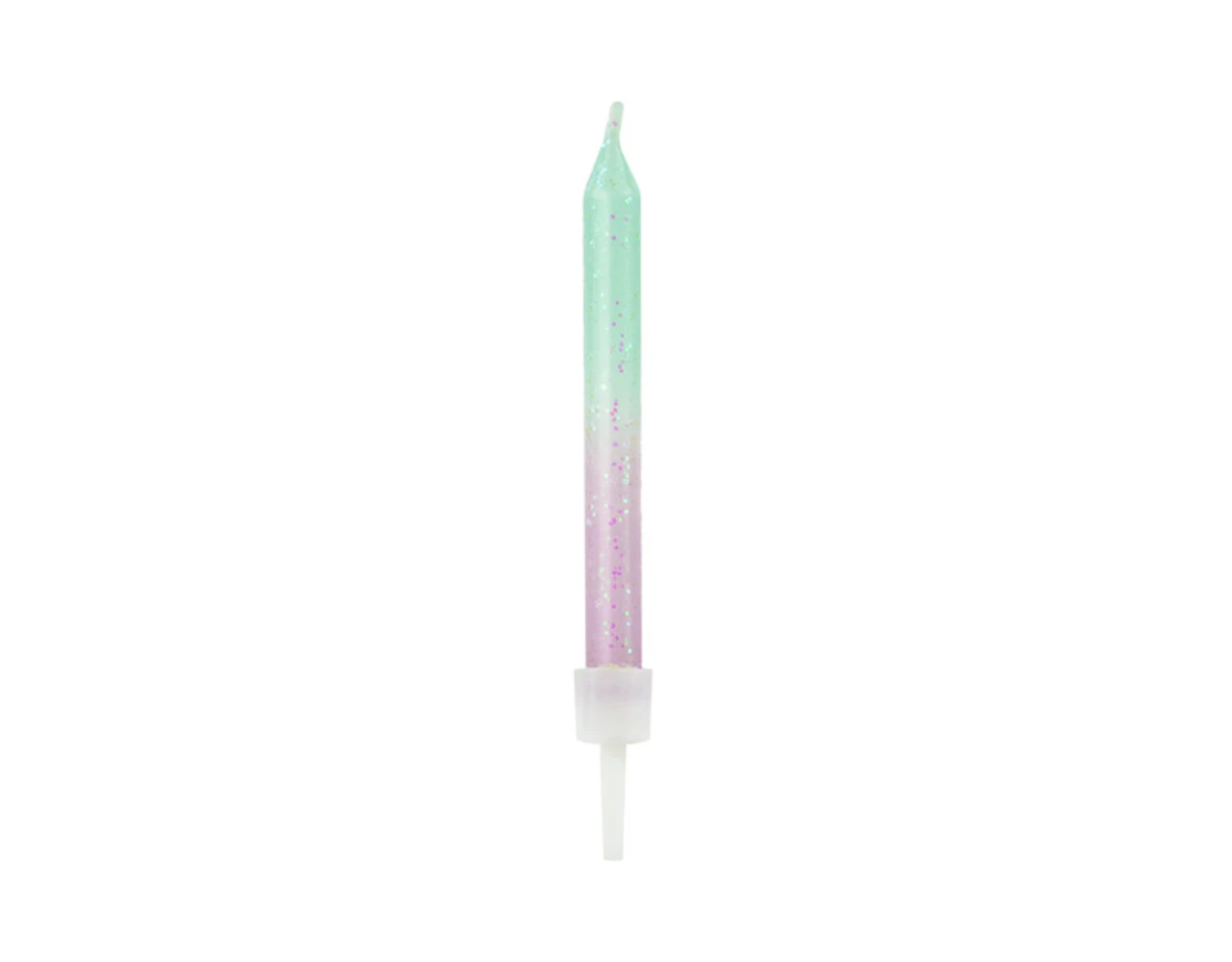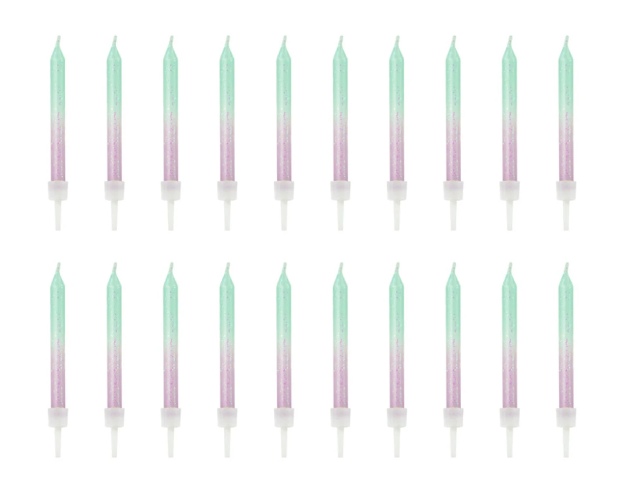 Verjaardagskaarsjes ombre, mix van kleuren (blauw – paars), hoogte ca. 6 cm. Set bestaat uit 20 kaarsen en houders.