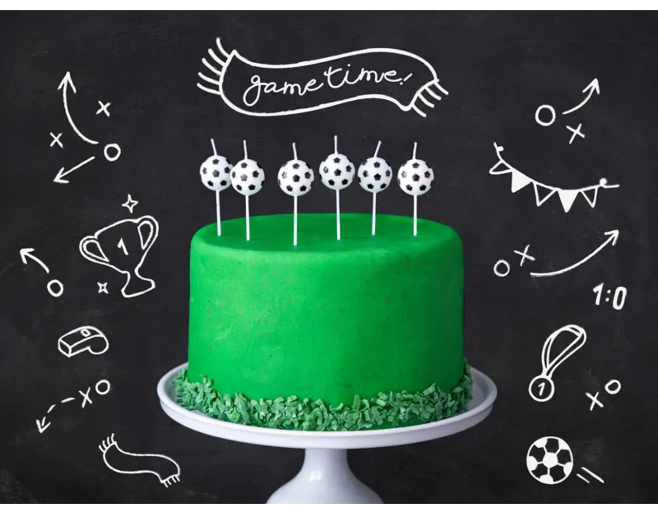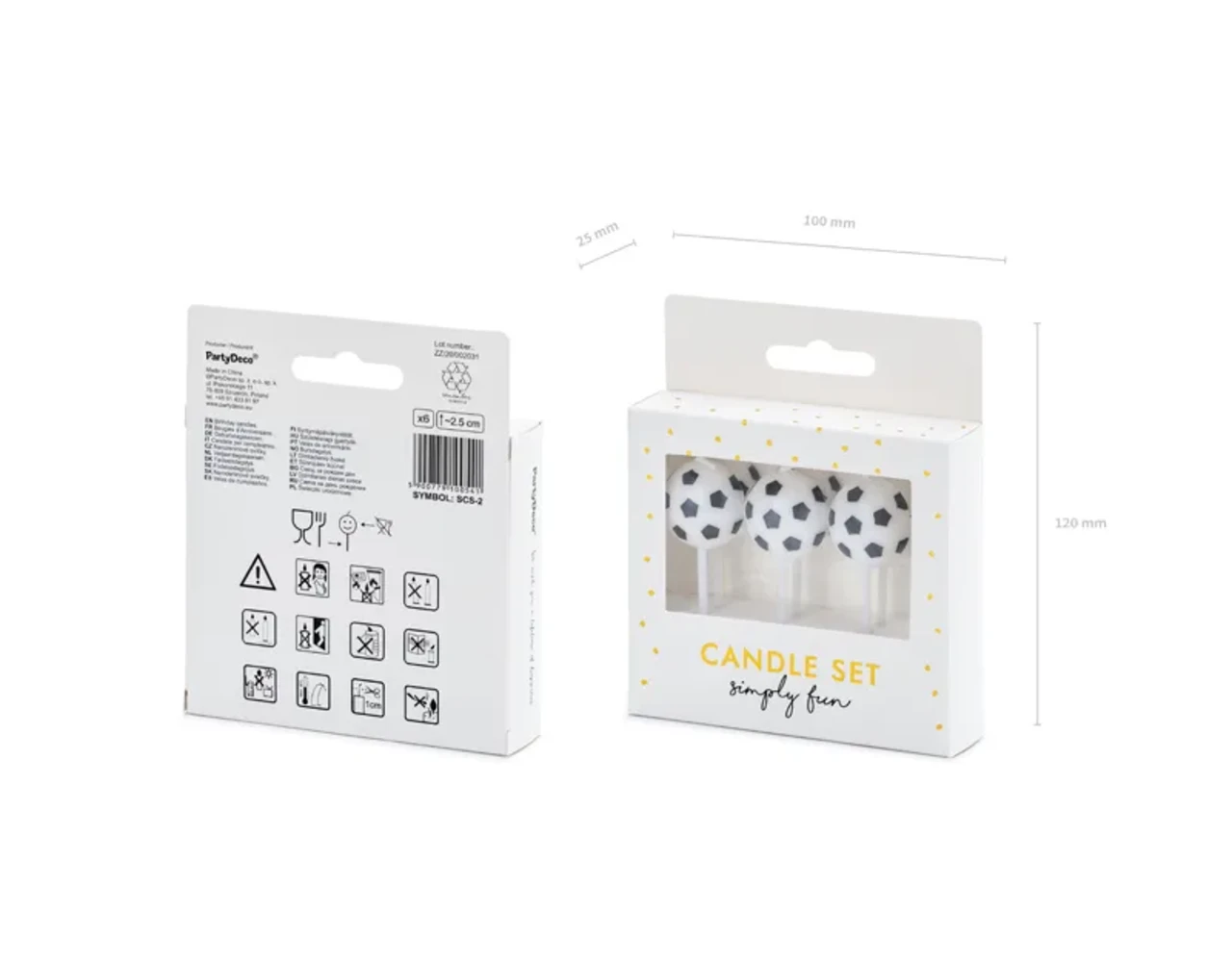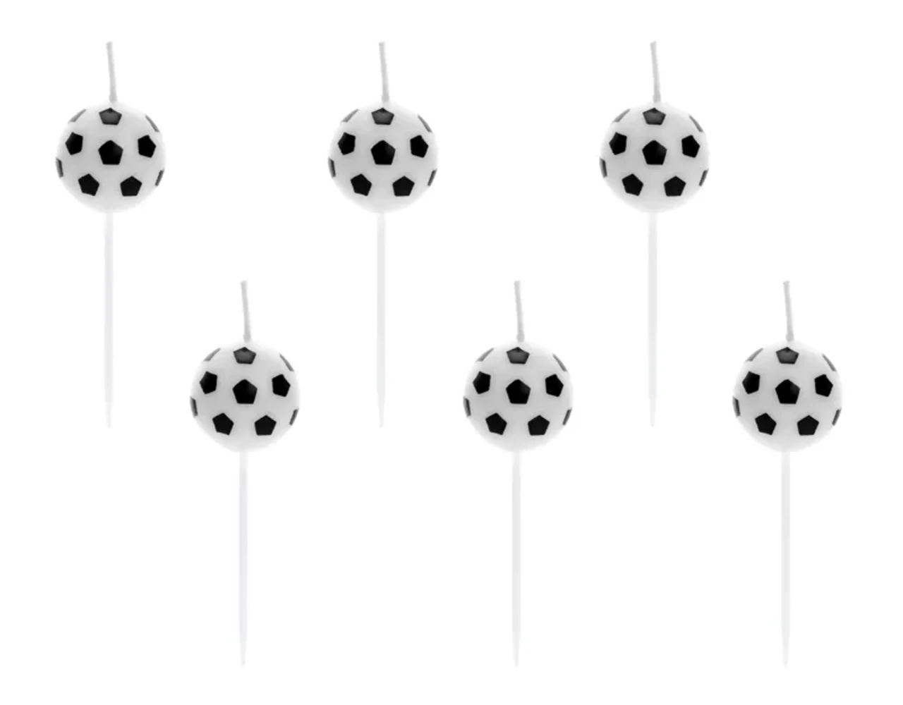 Verjaardagskaarsjes in de vorm van voetballen in wit en zwarte kleur, hoogte ca. 2,5 cm.