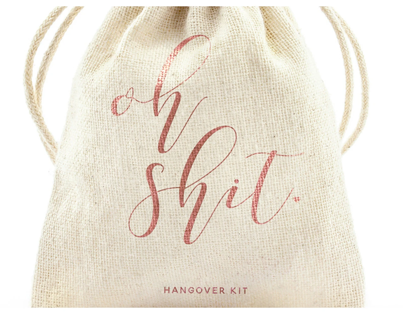 Trekkoordzakjes van katoen met rosŽgoudkleurig opschrift Oh shit, afmeting ca. 10 x 15 cm.