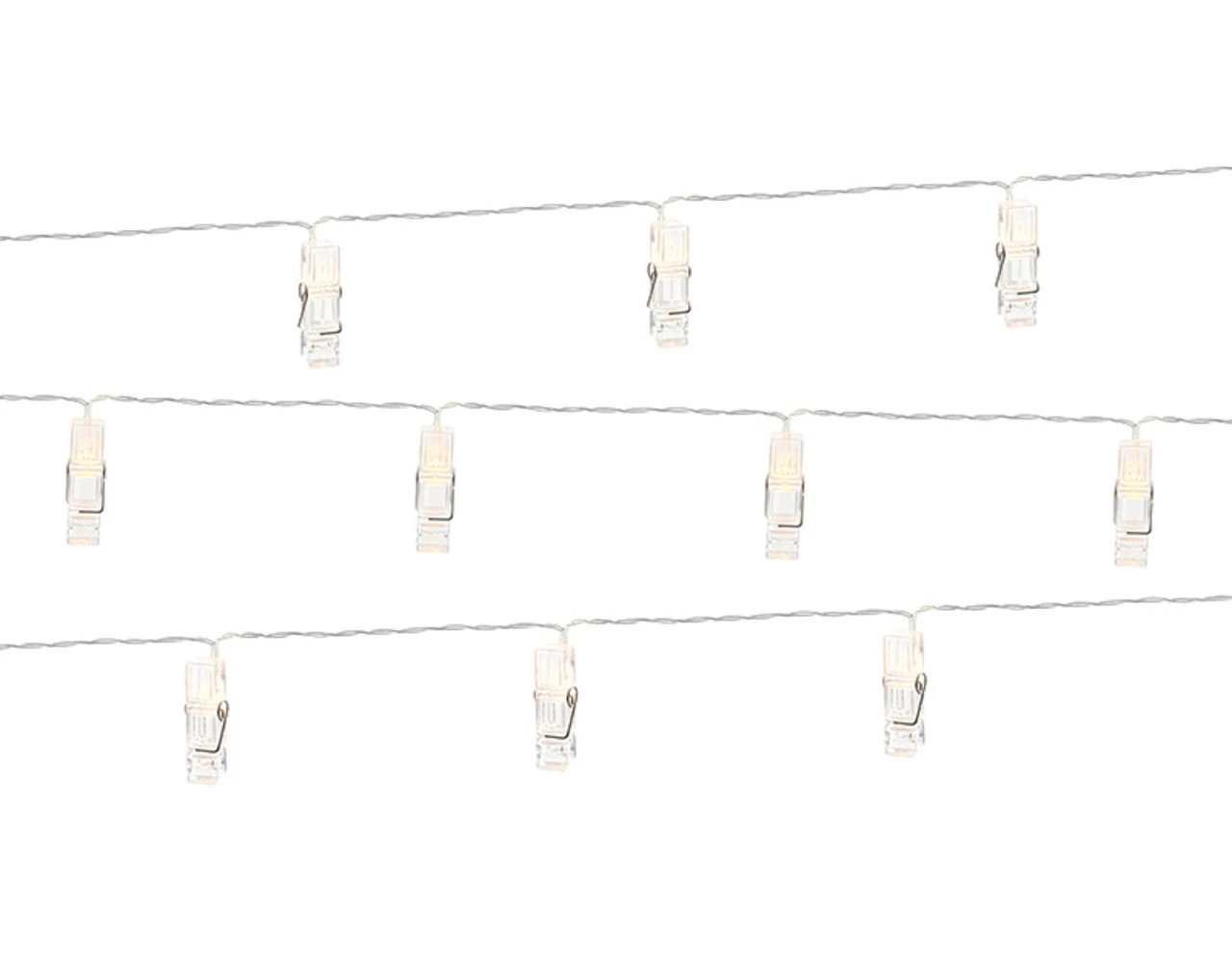LED fotoclips lampjes, helder op helder draad, lengte draad met lampjes ca. 1,4 m, 10 clips, warm gele kleur van het licht. Geschikt voor zowel binnen- als buitengebruik. Werkt op batterijen. Lampjes kunnen niet worden aangesloten op lichtsets.