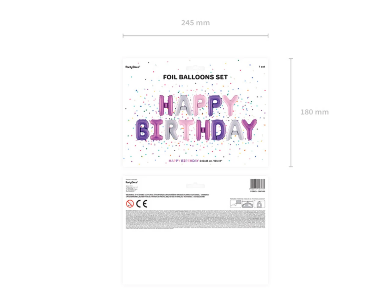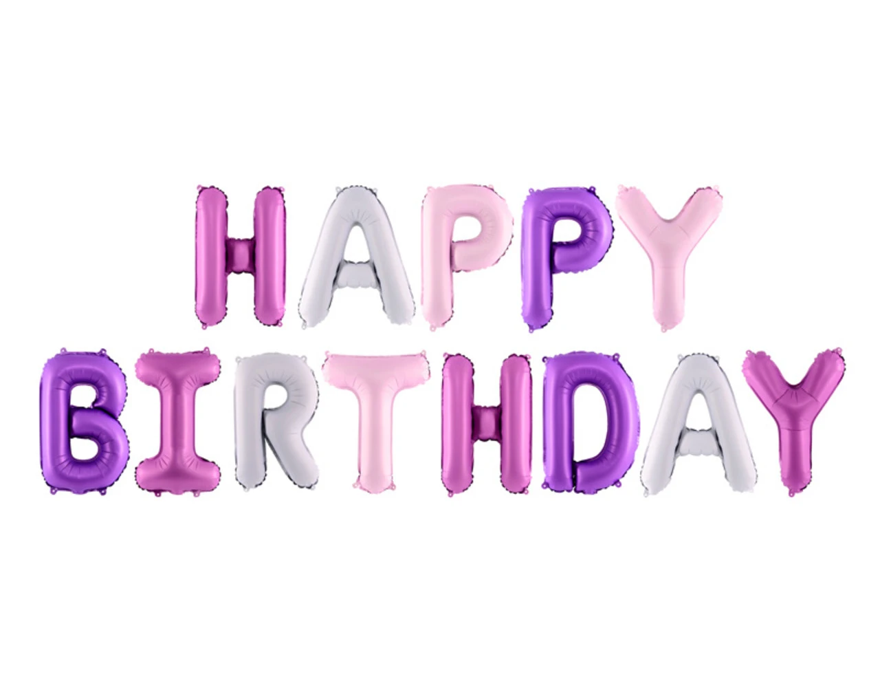 Pastel folie ballon Happy Birthday, mix van kleuren (donkerroze, lichtroze, lila en violet), formaat ca. 340 x 35 cm (134 x 14”).
