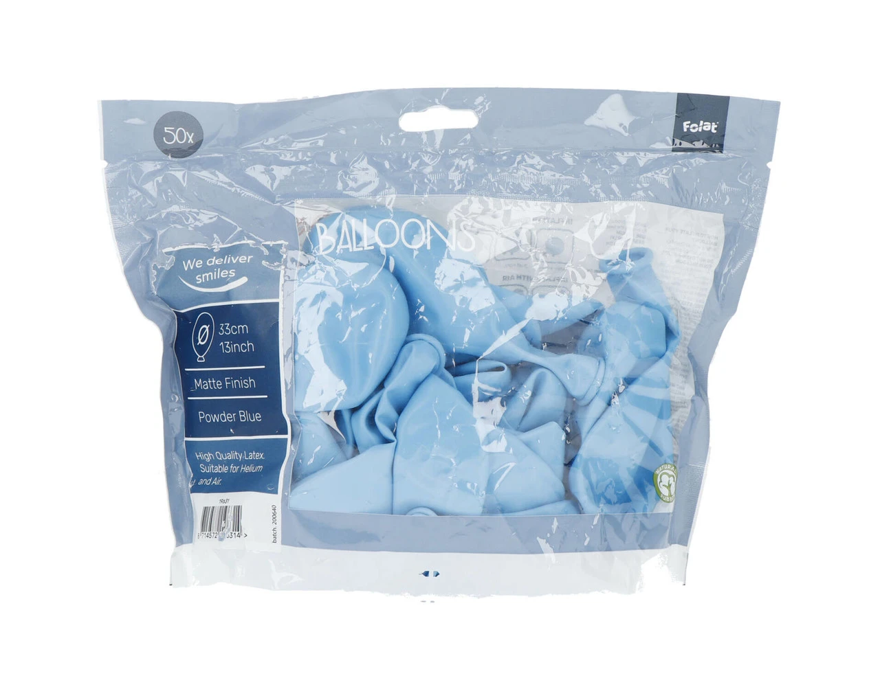 Ballonnen Powder Blue Mat 33cm – 50 stuks. Inhoud: 50 latex ballonnen. Kleur: Blauw. Bijvoorbeeld te gebruiken tijdens de volgende feestgelegenheid/feestgelegenheden: Verjaardag, Kinderfeestje en Themafeest. Elke ballon is 13 inch/33 cm. Het artikel is gemaakt van latex.