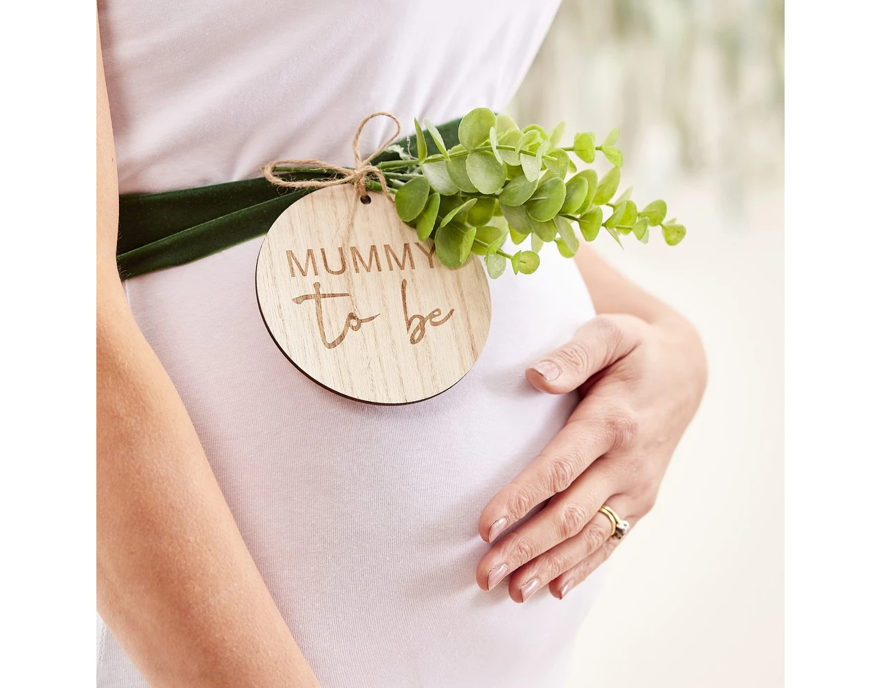 Deze prachtige mummy to be babyshower buiksjerp is perfect voor een natuurlijk thema. De houten badge is verfraaid met een pop van gebladerte en vormt een perfecte aanvulling op de donkergroene fluwelen band.