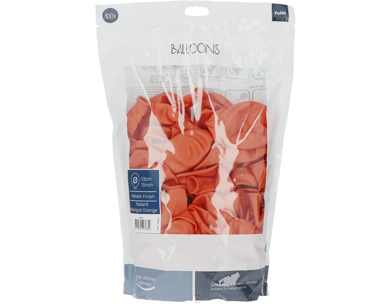 Ballonnen Radiant Marigold Orange Metallic 33cm – 100 stuks. Inhoud: 100 latex ballonnen. Kleur: Oranje. Kleureffect: Metallic. Bijvoorbeeld te gebruiken tijdens de volgende feestgelegenheid/feestgelegenheden: Verjaardag, Kinderfeestje en Themafeest. Elke ballon is 13 inch/33 cm. Het artikel is gemaakt van latex.