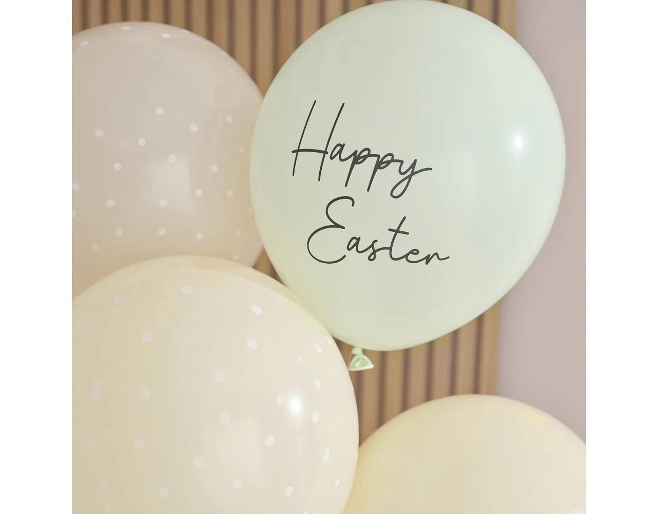Met een mix van pastelkleurige ballonnen, stippenballonnen en ‘Happy Easter’-boodschap vormen ze de ultieme paasdecoraties.