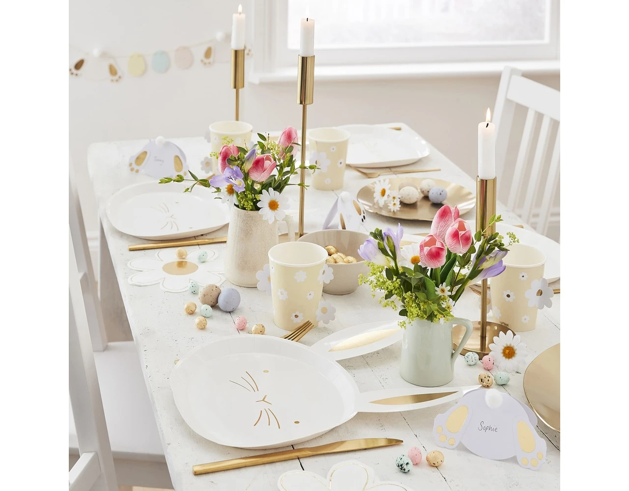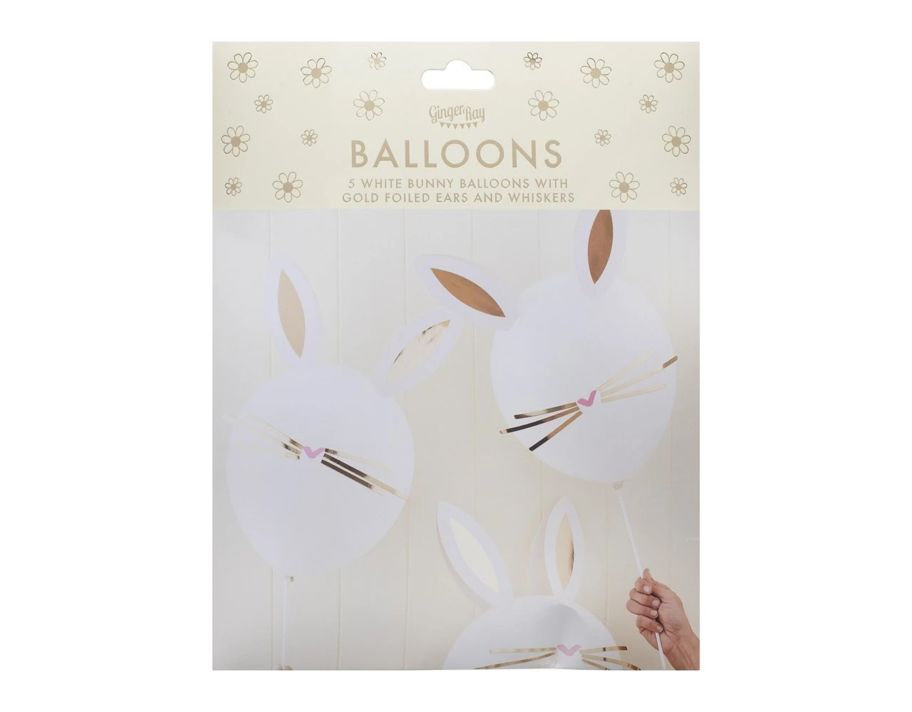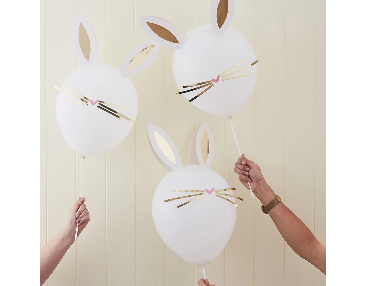Versier de ballonnen met de meegeleverde goudfolie-oren en goudfolie-snorharen om je kamer tot leven te laten komen met onze paasfeestballonnen.