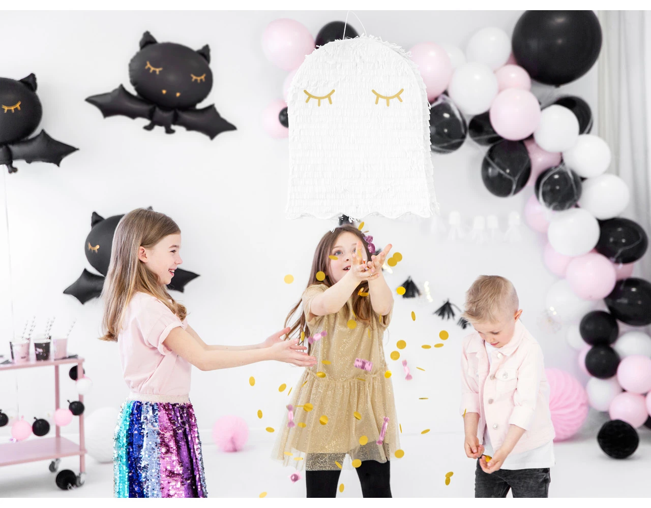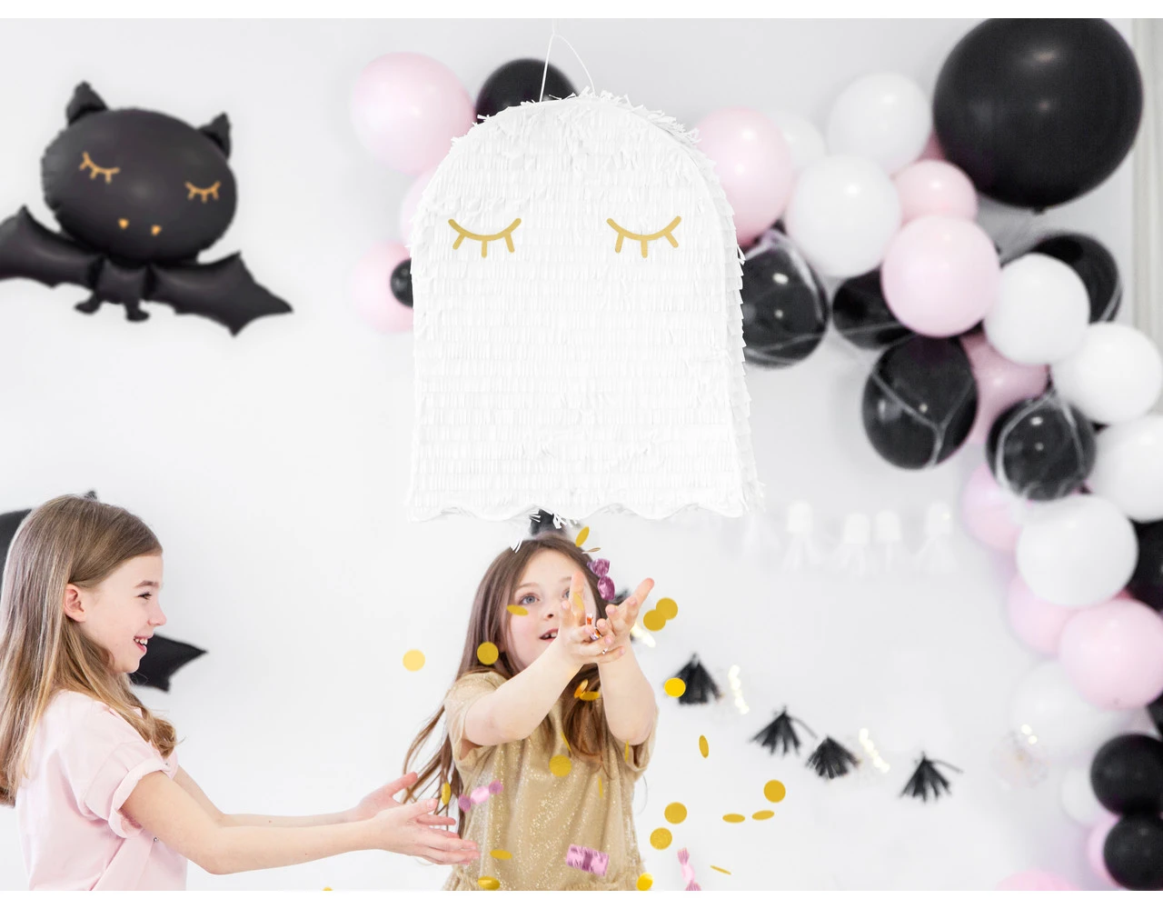 Inhoud: Pinata in de vorm van ghost in de kleur wit met gouden ogen, tot ca. vullen met goodies, grootte. 41.5 x 50 x 10 cm.