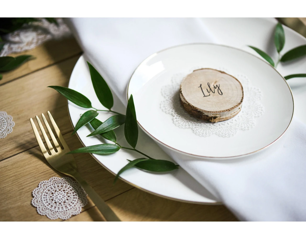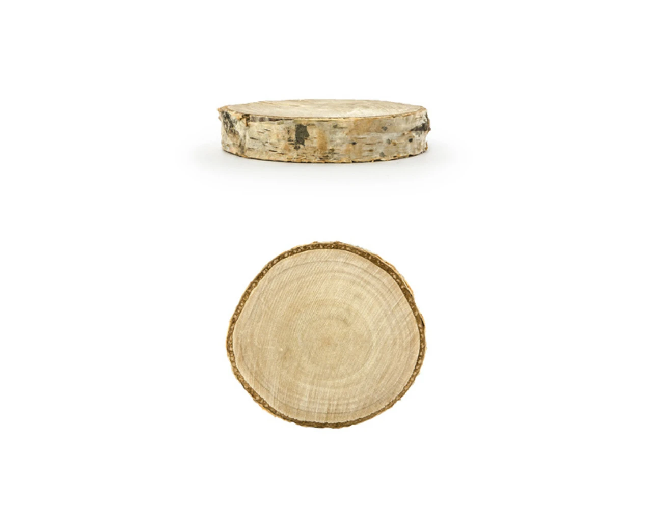 Houten tafelkaartje, diameter ca. 4,5-6,5 cm, hoogte ca. 1 cm.