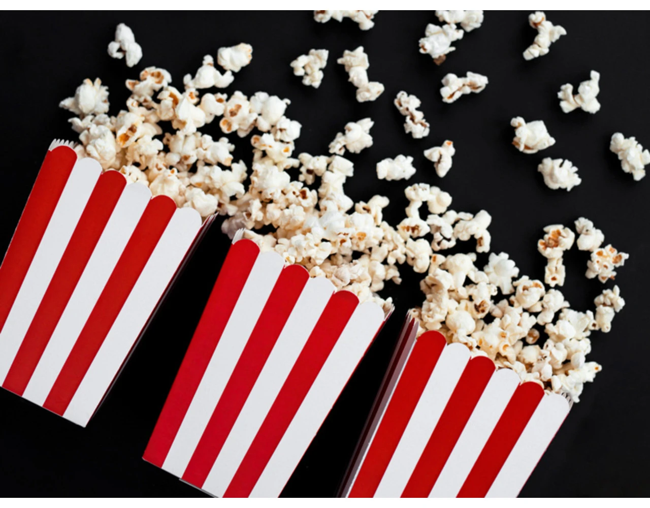 Doosjes voor popcorn in rode kleur met witte stroken, afmeting na assemblage ca. 7 x 7 x 12,5 cm.