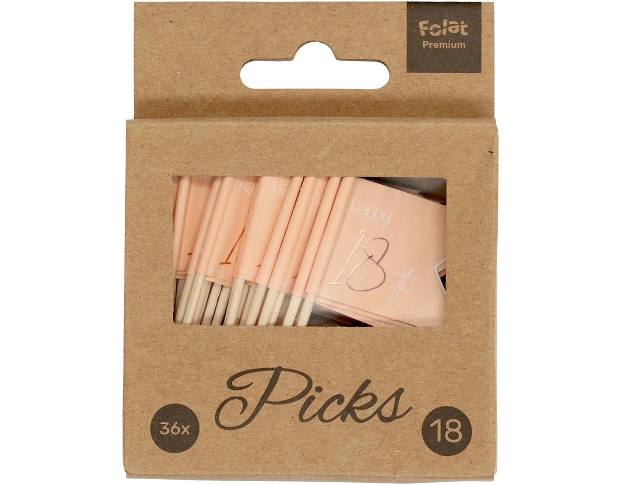 Prikkers Elegant Lush Blush 18 Jaar – 36 stuks. Inhoud: 36 prikkers. Kleur: Roze. Bijvoorbeeld te gebruiken tijdens de volgende feestgelegenheid/feestgelegenheden: Verjaardag, Jubileum. Afmetingen: 6,5 cm hoog. Het artikel is gemaakt van bamboe.