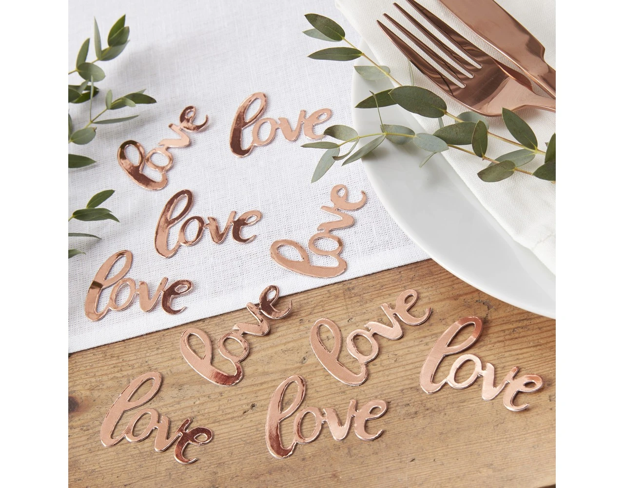 Deze roségouden tafelconfetti met ‘liefde’-woord is de perfecte finishing touch voor je tafelaankleding. Strooi de confetti rond elke couvert om uw evenement een prachtige roségouden gloed te geven.