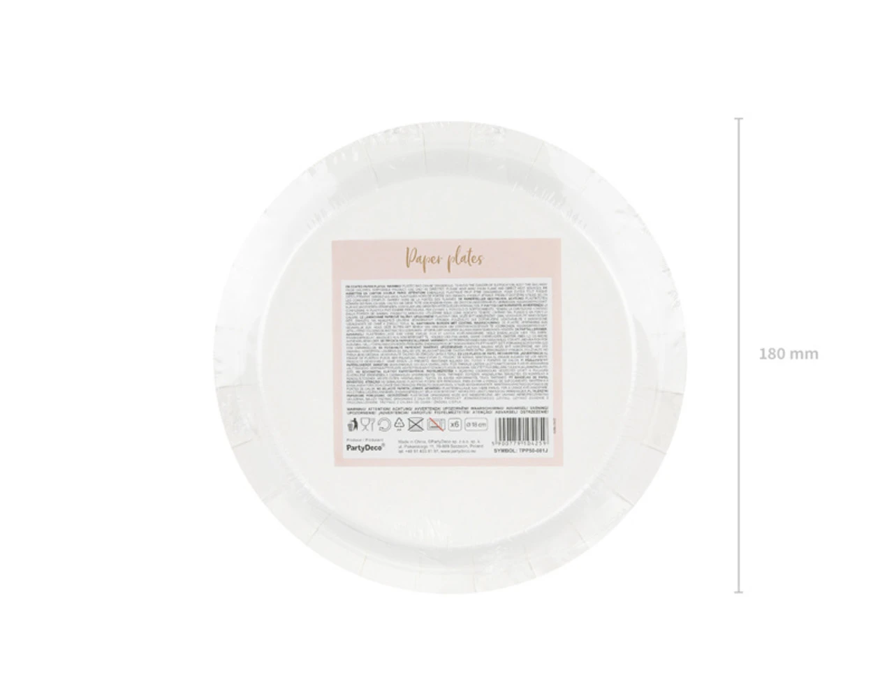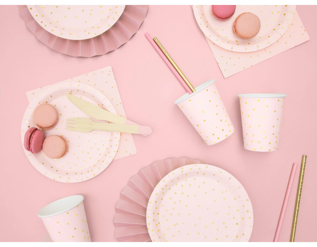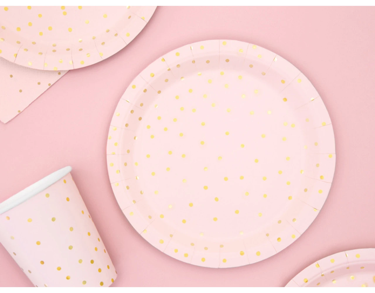 Papieren bordjes in lichtroze kleur met goudkleurig stippenpatroon, doorsnede ca. 18 cm.