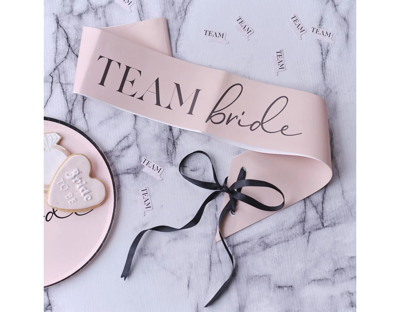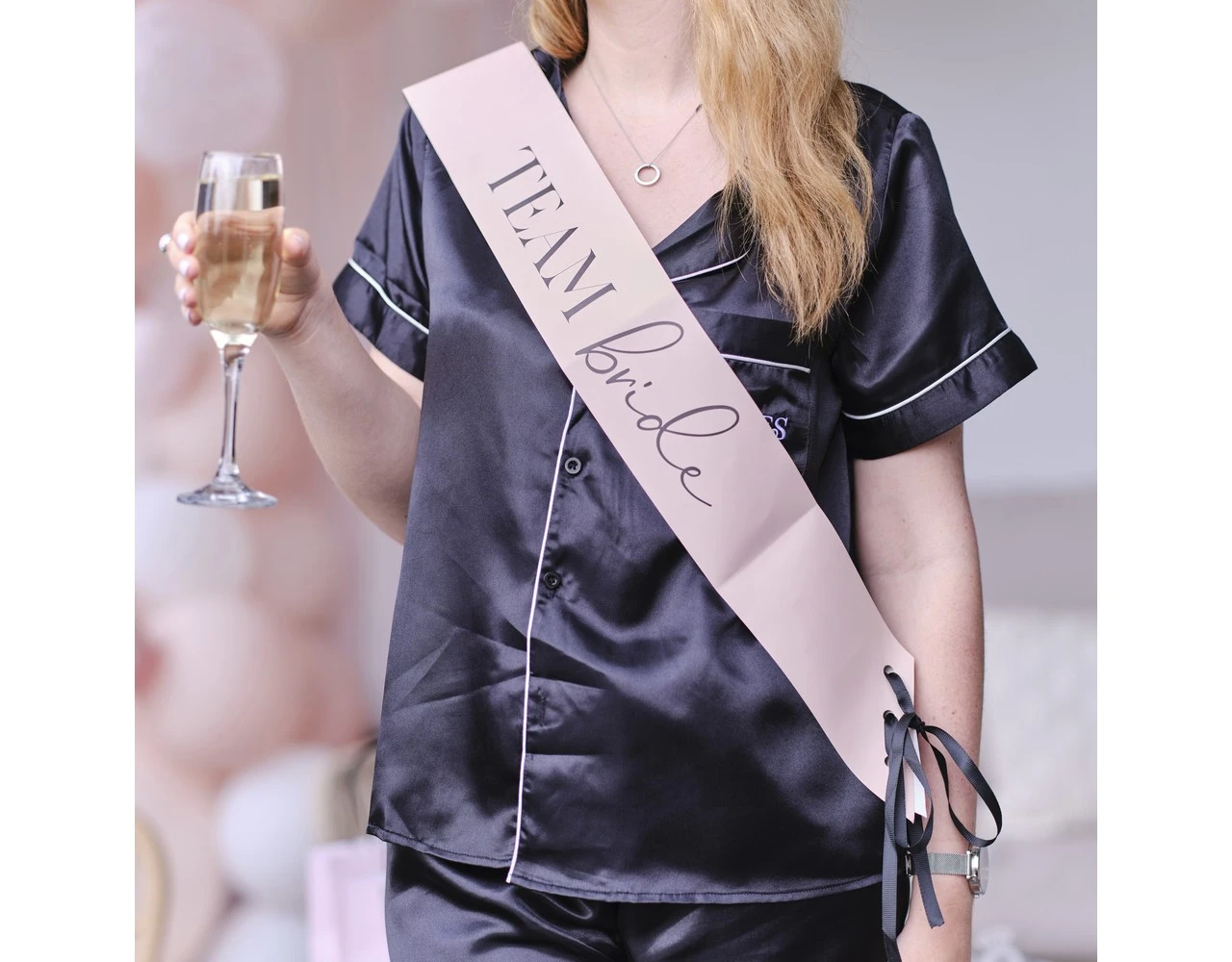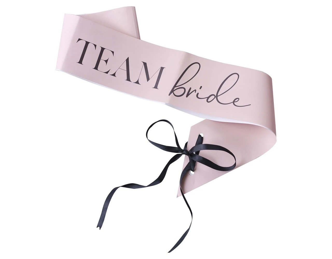 De roze papieren sjerpen hebben een prachtig zwart Team Bride-lettertype dat zeker geliefd zal zijn bij alle kippen!