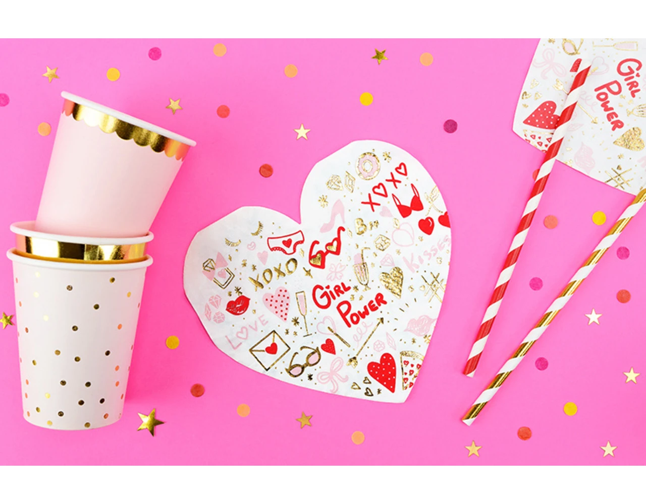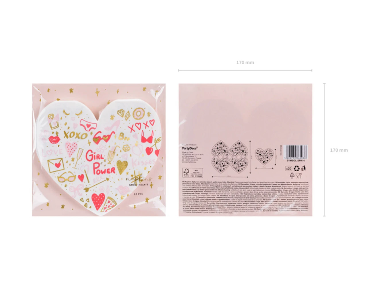 Papieren hapkins Hart in witte kleur met lichtroze, rode en gouden metallic print, afmeting na uitvouwen ca. 32 x 30 cm, afmeting na in elkaar zetten ca. 16 x 15 cm.