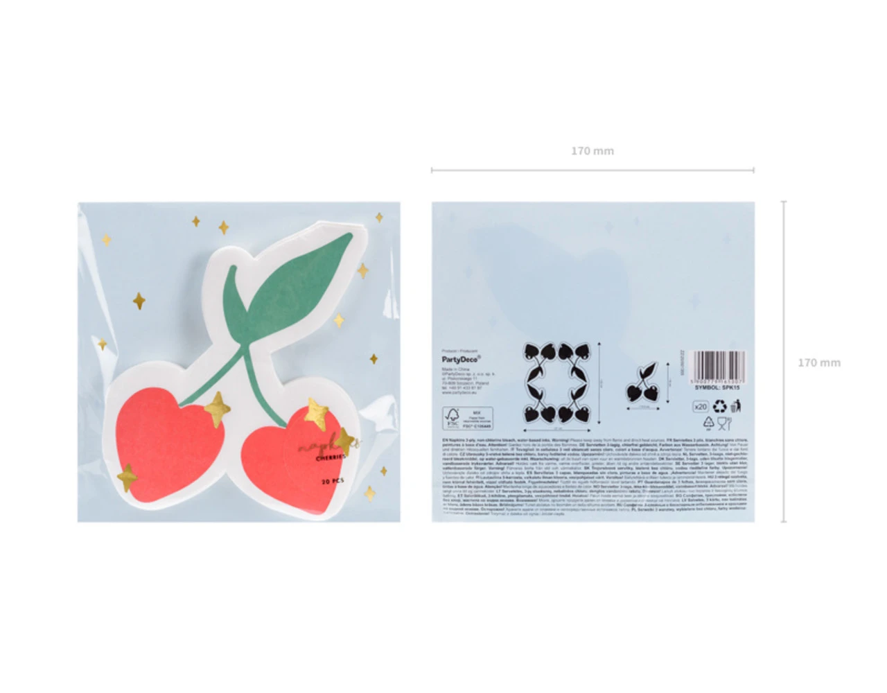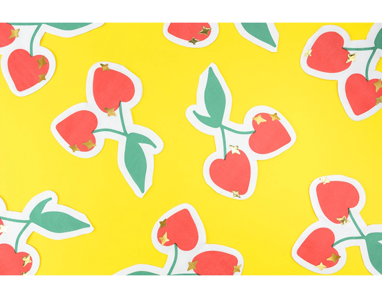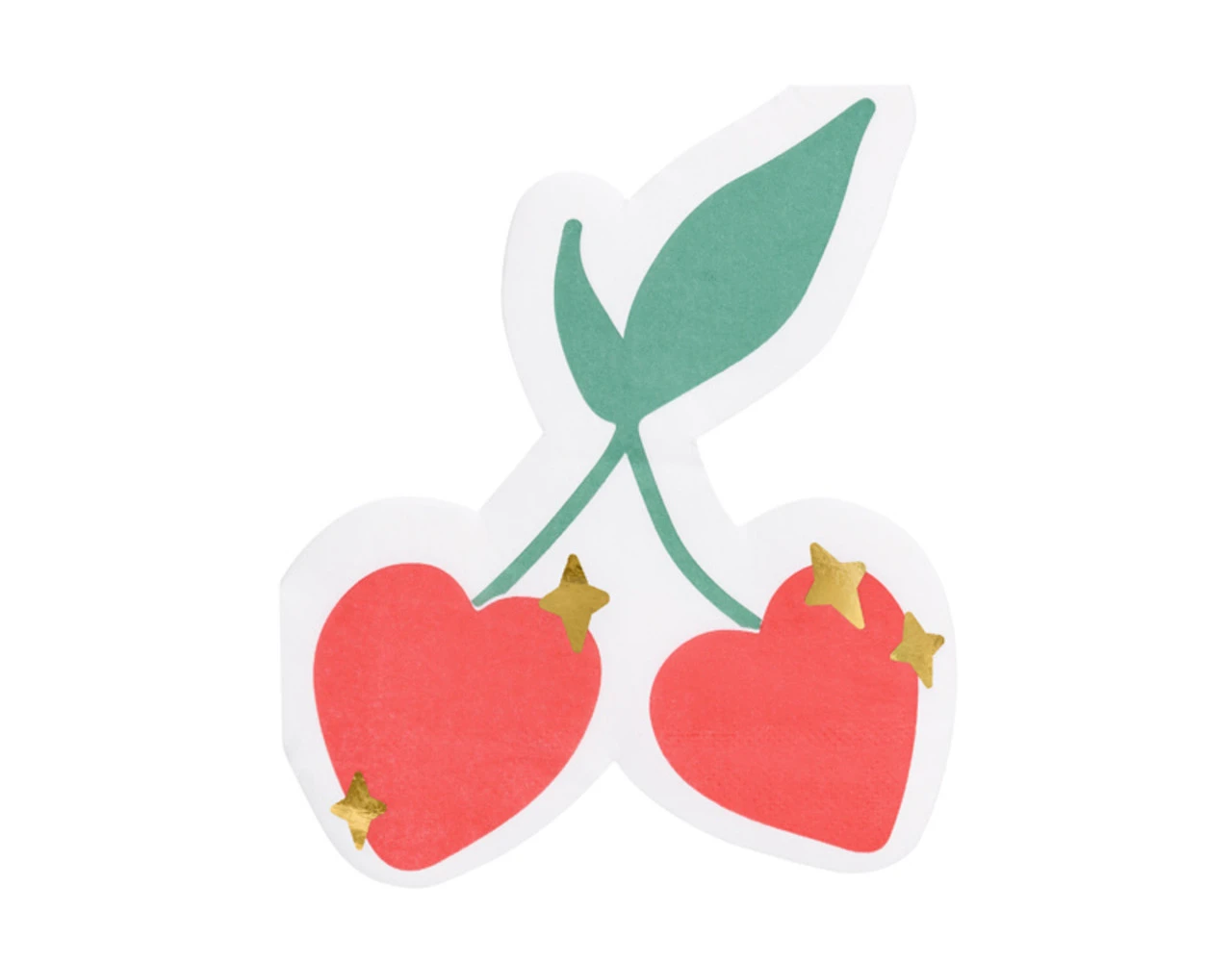 Papieren servetten Kersen in witte kleur met groene, rode en gouden metallic print, afmeting na uitvouwen ca. 27 x 32 cm, afmeting na samenvoegen ca. 13,5 x 16 cm.