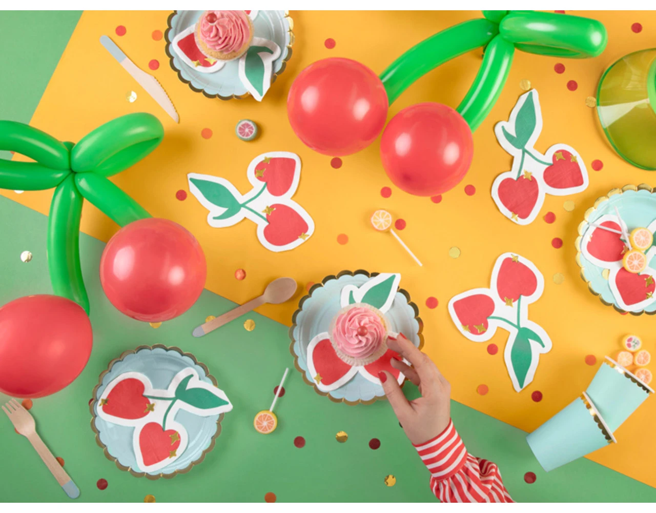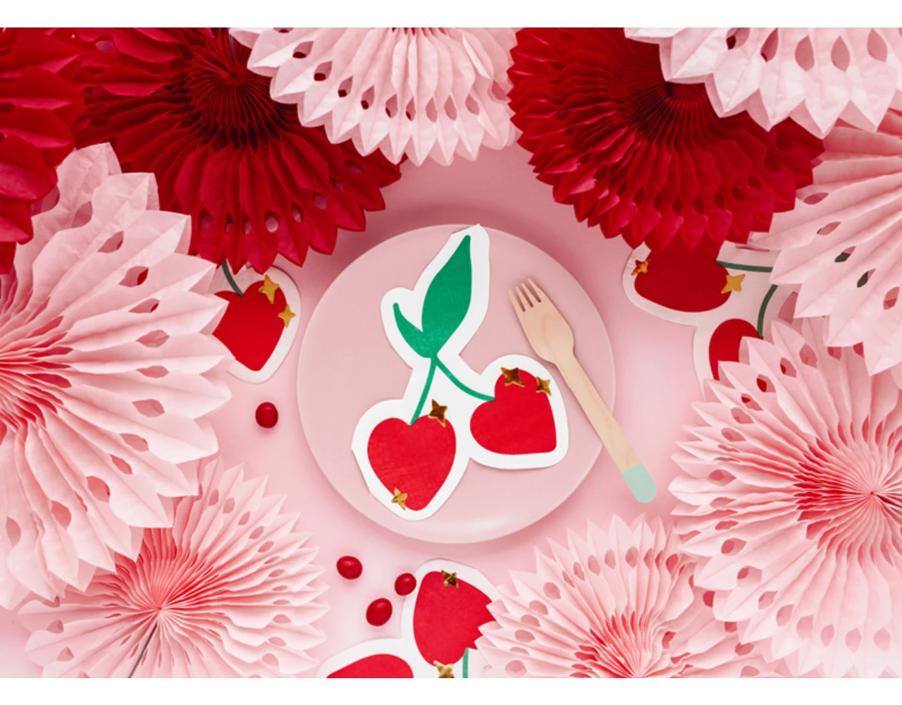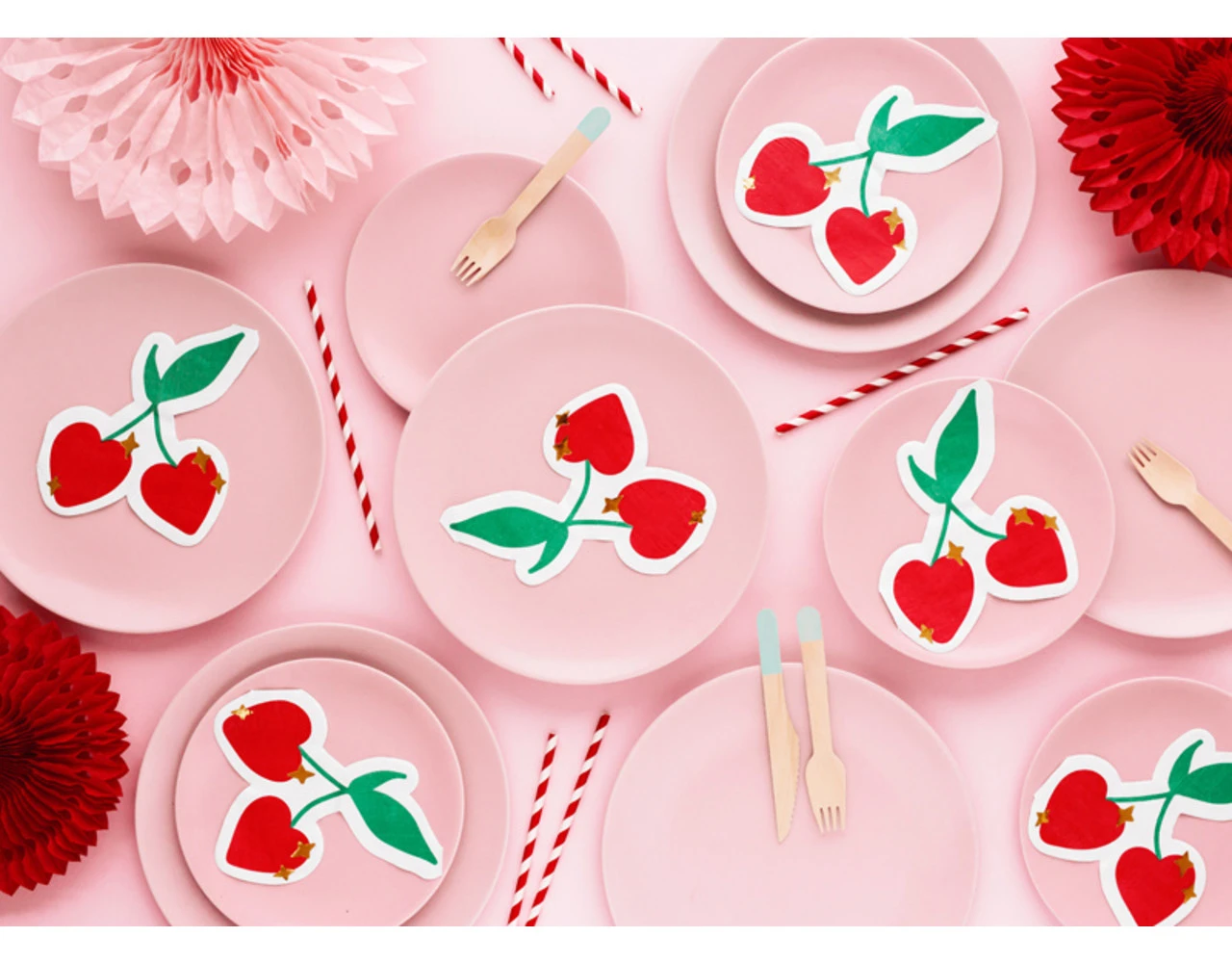 Papieren servetten Kersen in witte kleur met groene, rode en gouden metallic print, afmeting na uitvouwen ca. 27 x 32 cm, afmeting na samenvoegen ca. 13,5 x 16 cm.