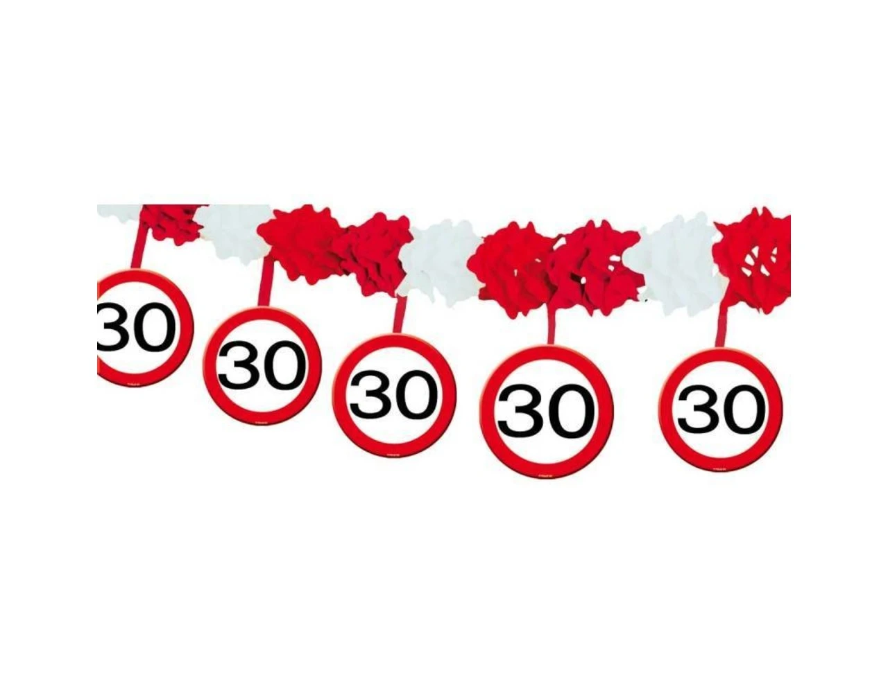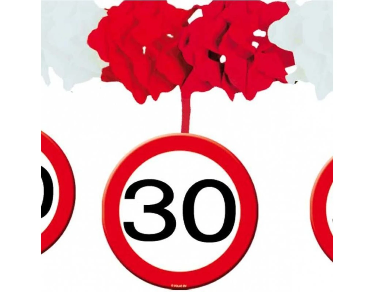30 Jaar Verkeersbord Slinger met Onderhanger. Inhoud: 1 slinger. Kleur: Meerkleurig. Bijvoorbeeld te gebruiken tijdens de volgende feestgelegenheid/feestgelegenheden: verjaardag, jubileum. Deze slinger is 4 meter lang. Deze papierslinger is gemaakt van papier.