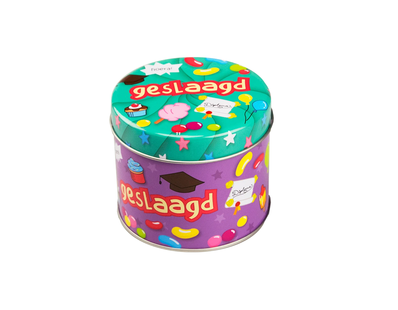Verpakkingsinhoud: Snoepblik Geslaagd School 9cm
