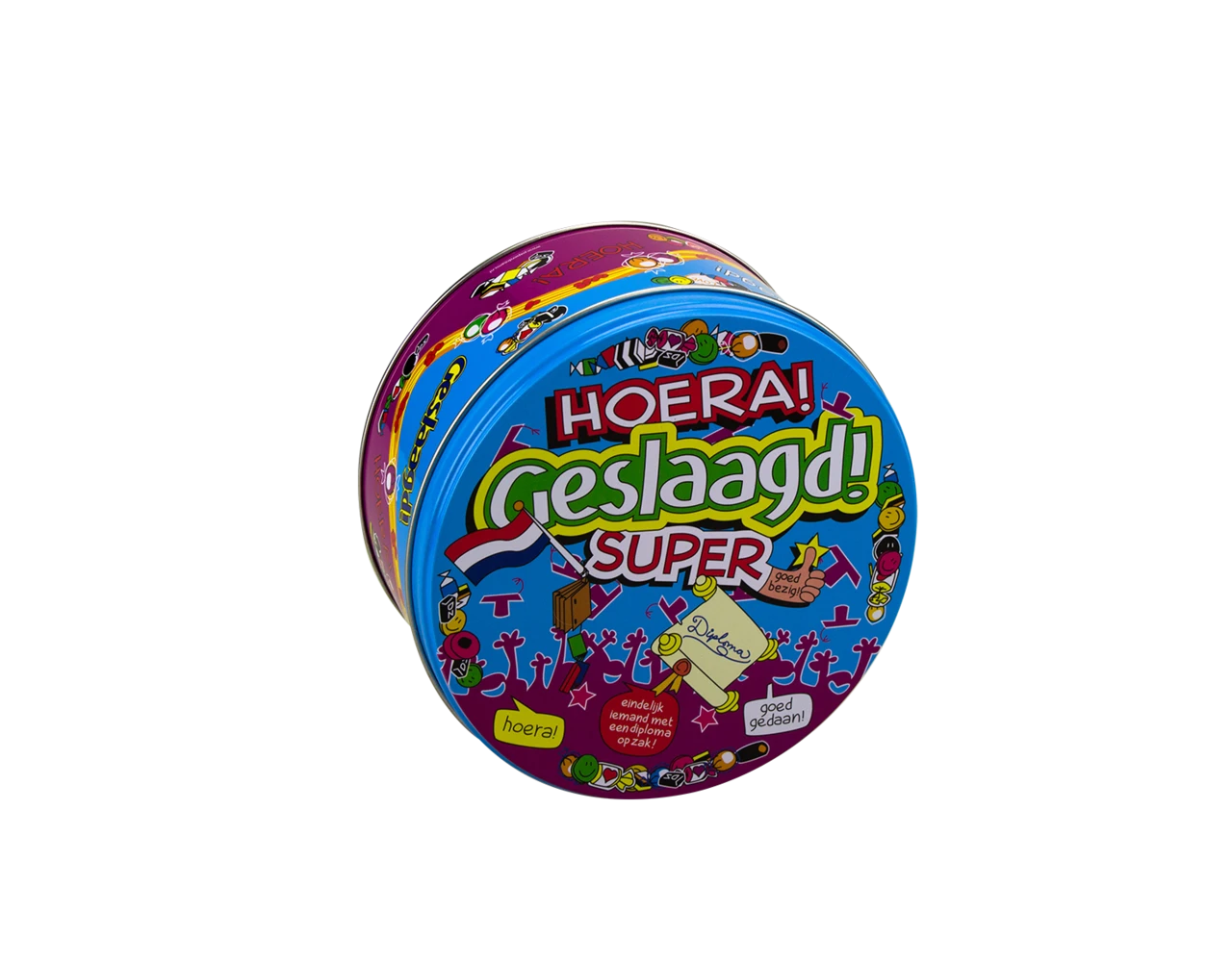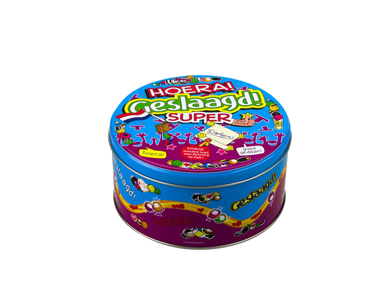 Verpakkingsinhoud: Snoeptrommel Geslaagd School 14cm