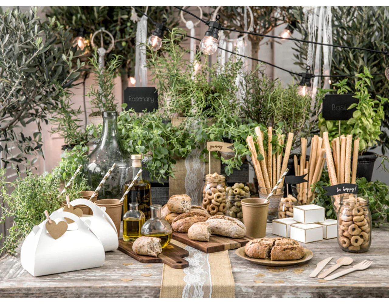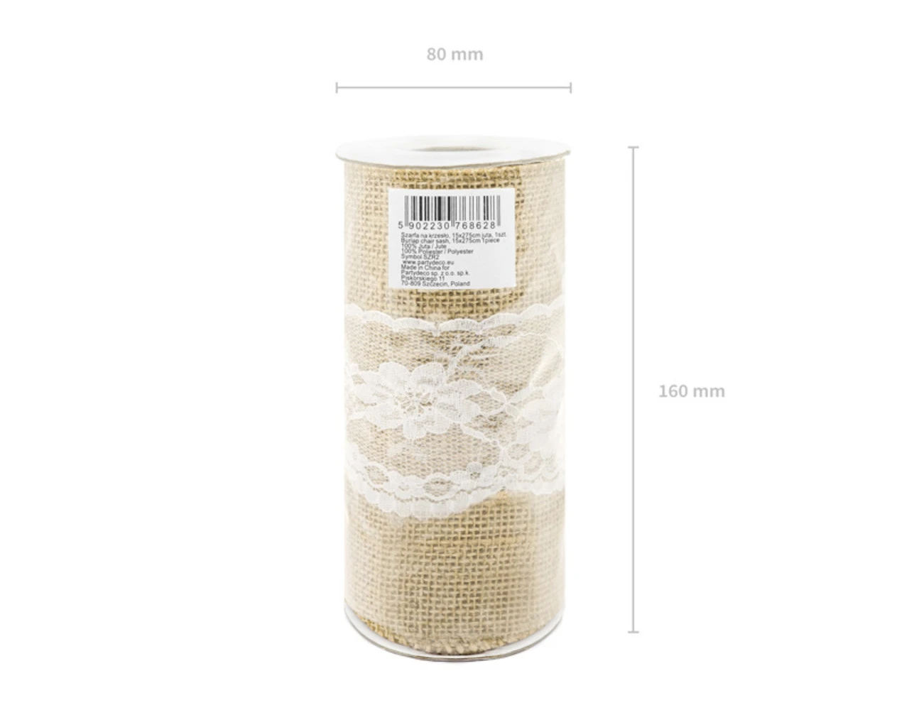 Burlap stoel sjerp met kant, breedte ca. 15 cm, lengte ca. 2,75 m.