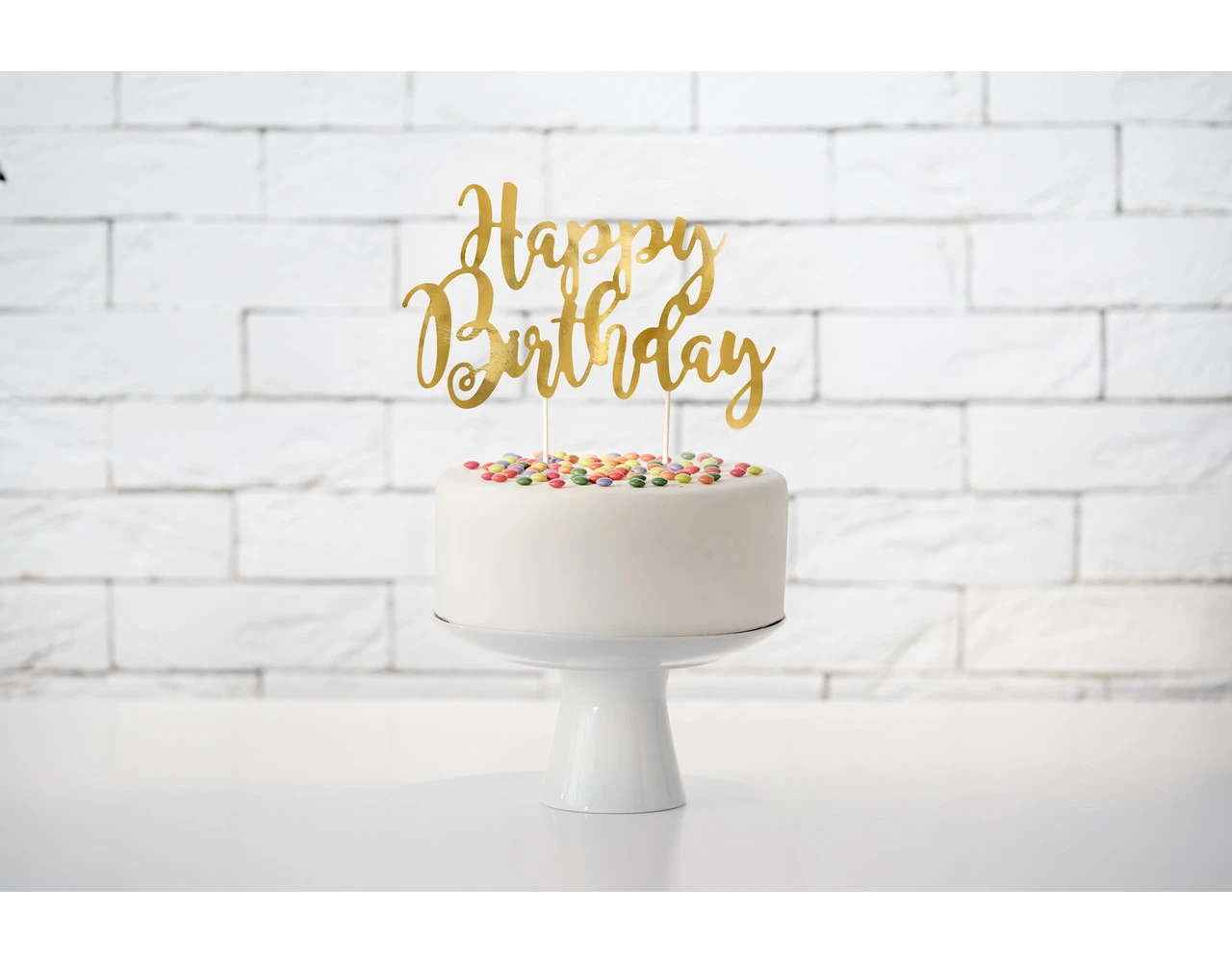 Inhoud: Cake topper Happy Birthday, gemaakt van goud spiegel papier, lengte ong. 22,5 cm.
