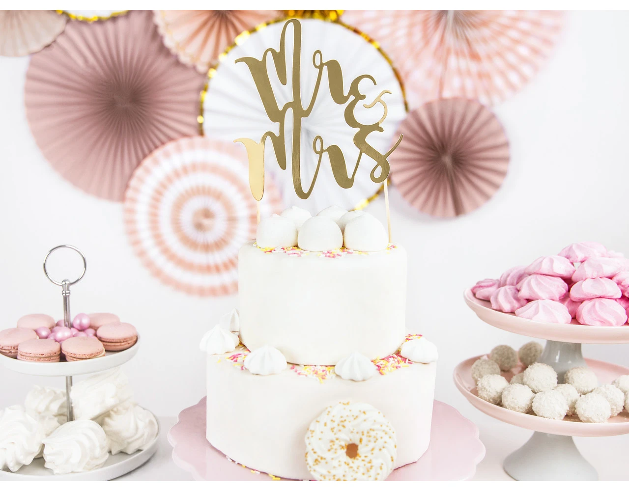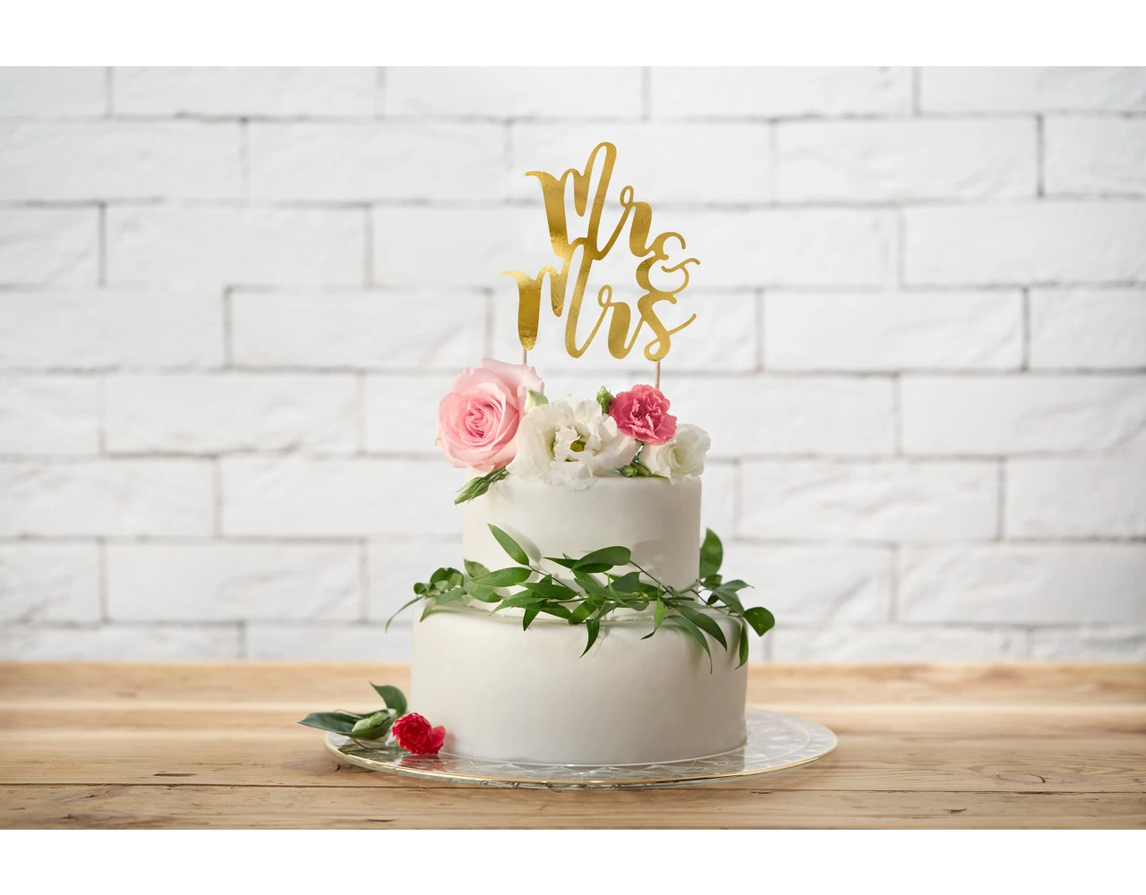 Inhoud: Cake topper Mr & Mrs, gemaakt van goud spiegel papier, lengte ong. 25,5 cm.