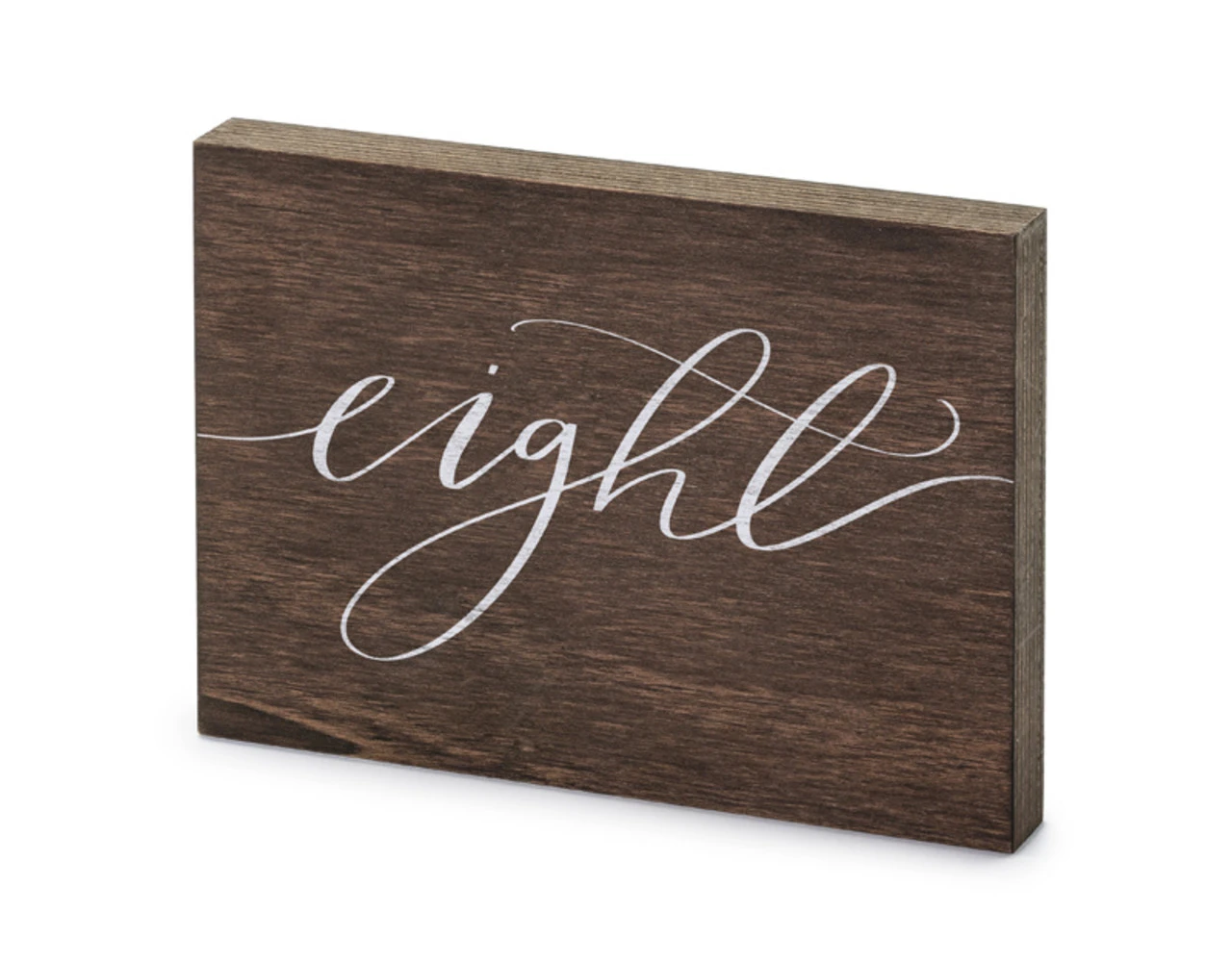 Houten tafelnummer met wit opschrift ”Eight”, afmeting ca. 2x18x12,5 cm