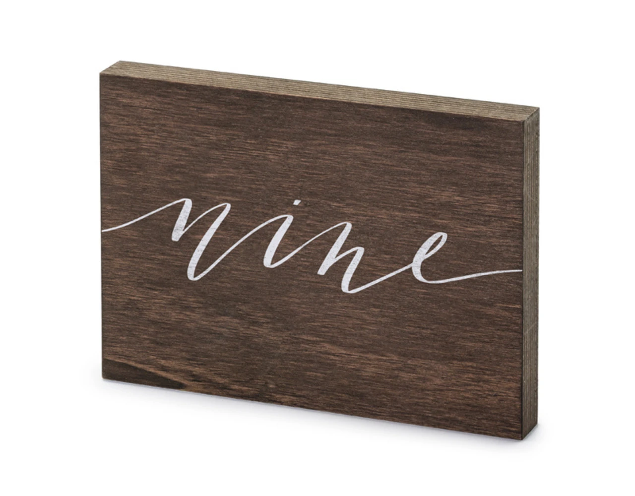 Houten tafelnummer met wit opschrift ”Nine”, afm. ca. 2x18x12,5 cm